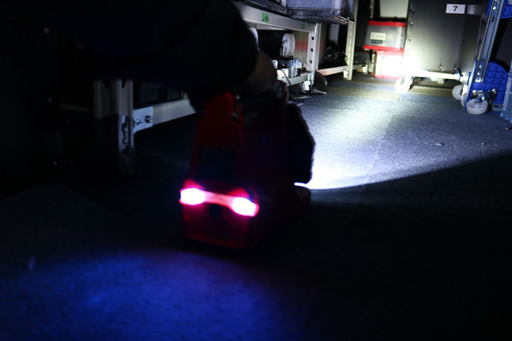 ライトユニットと本体を繋ぐ首部分は従来のE-SPOTよりも構造的に強化されています。また、チルトのノッチはしっかりしていて、自重で角度が変るようなことも無く、ネジ等で締める必要もありません。素早い展開と継続的な角度維持が可能です。これまで消防関係のライトは、特化した尖った性能を持ったものが多かったのですが、このライトは汎用的な使い方が可能です。置いて使えるので、例えば消防用具や車両の点検など日常の様々な業務に使えます。