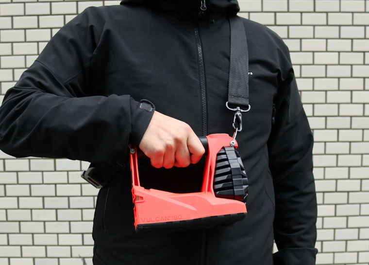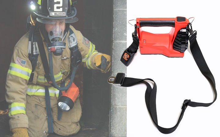 バルカン180はオレンジボディの「ファイアー」とイエローボディの「インダストリー」があります。二点の違いは付属するショルダーベルトのみ。性能、防爆規格は全く同じです。ファイアーに付属するショルダーベルトは車のシートベルトタイプ。これは重装備の消防士が肩からライトを外すことなく素早くライトの着脱を出来るようにするためのものです。