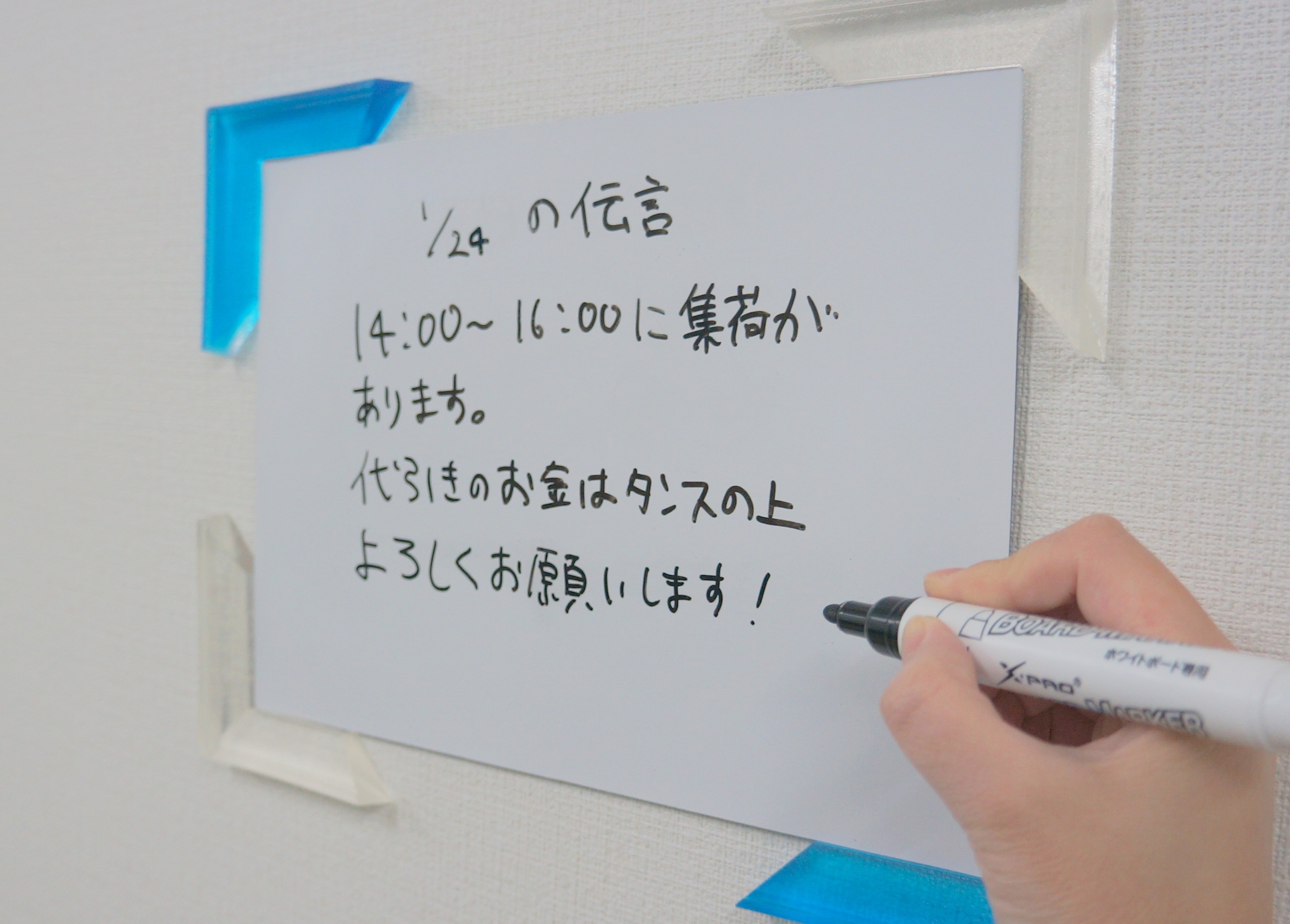 それは、マグネットで貼り付けるタイプのホワイトボード。マグネットで設置できる場所以外でも使いたいと思っていたので、早速ジェルフレームを使って壁に貼り付けてみました。すると…。