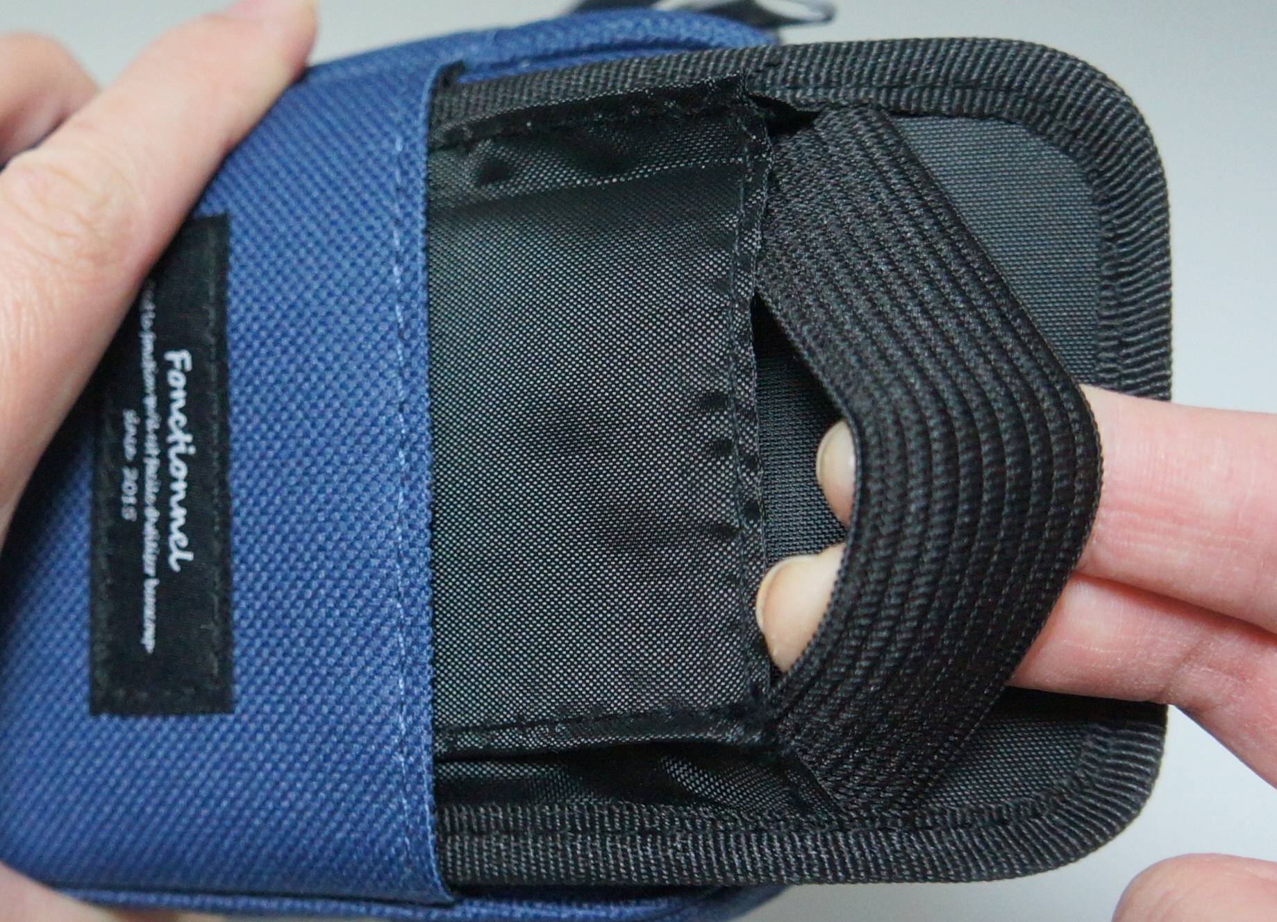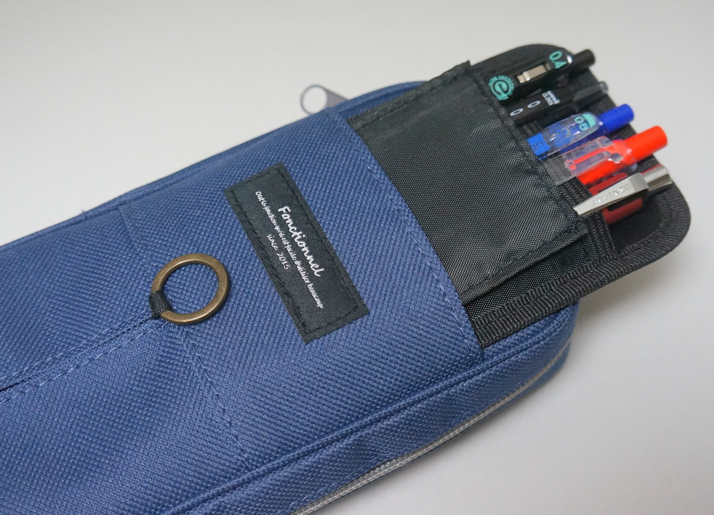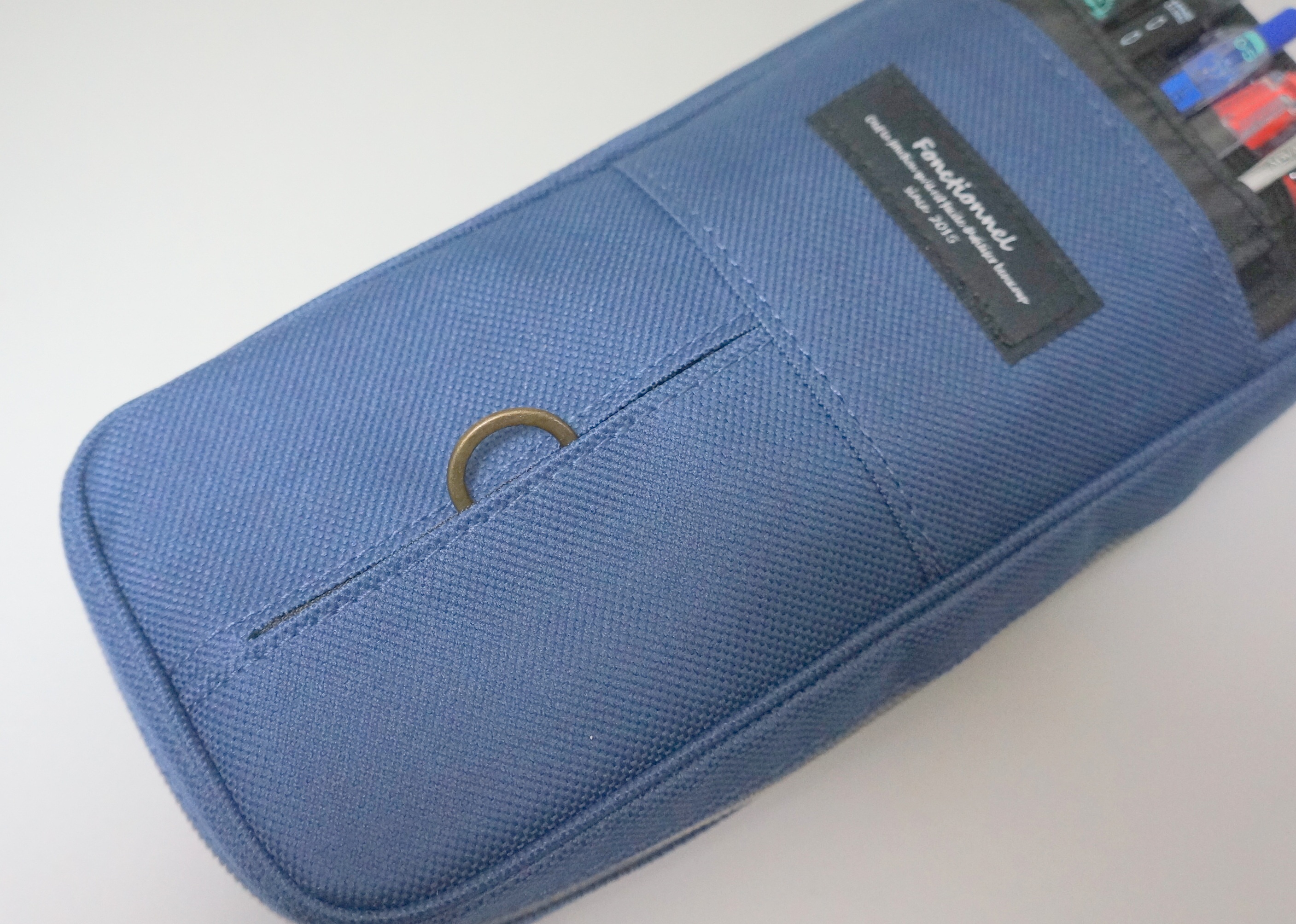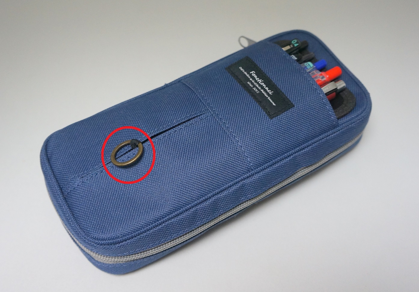 まずは基本的な構造を見てみましょう。ペンケースの前面を見ると、ポケットから小さい輪っかが飛び出ているのがわかります。これを引っ張ると…