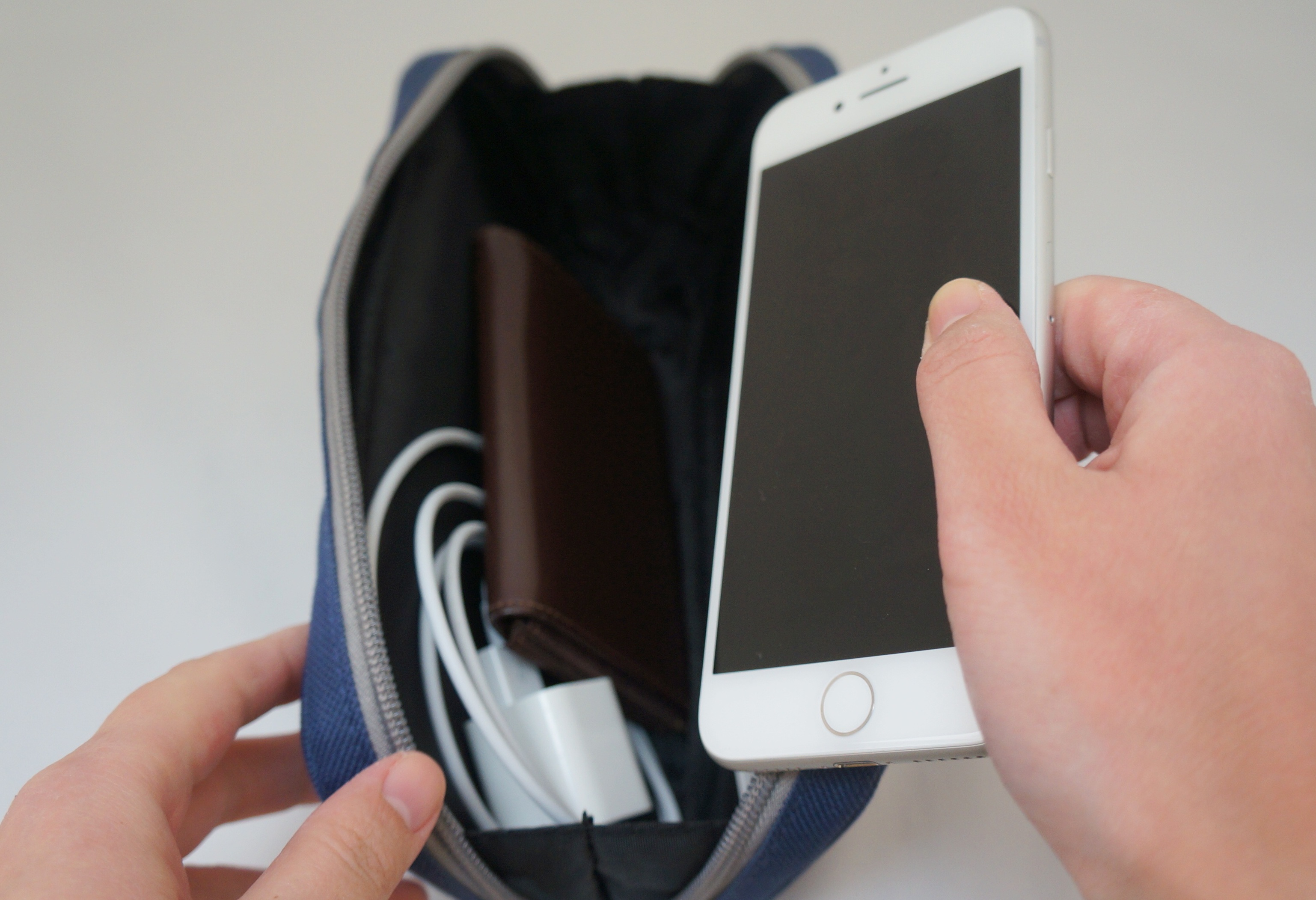 では、ペンケース本体には何を入れればいいのでしょう? 簡単です。ここには、スマホや充電器、名刺ケースなど普段バッグインバッグに収納するような持ち物をを入れればいいのです。