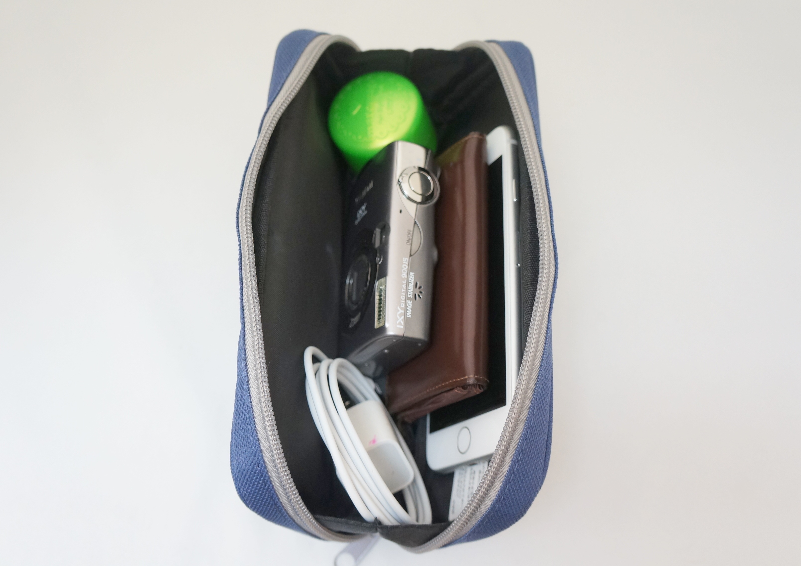 横に広く開くので、デジカメのように大きめなものも入れやすい。持ち物を、あらかた収納したのが下の画像です。