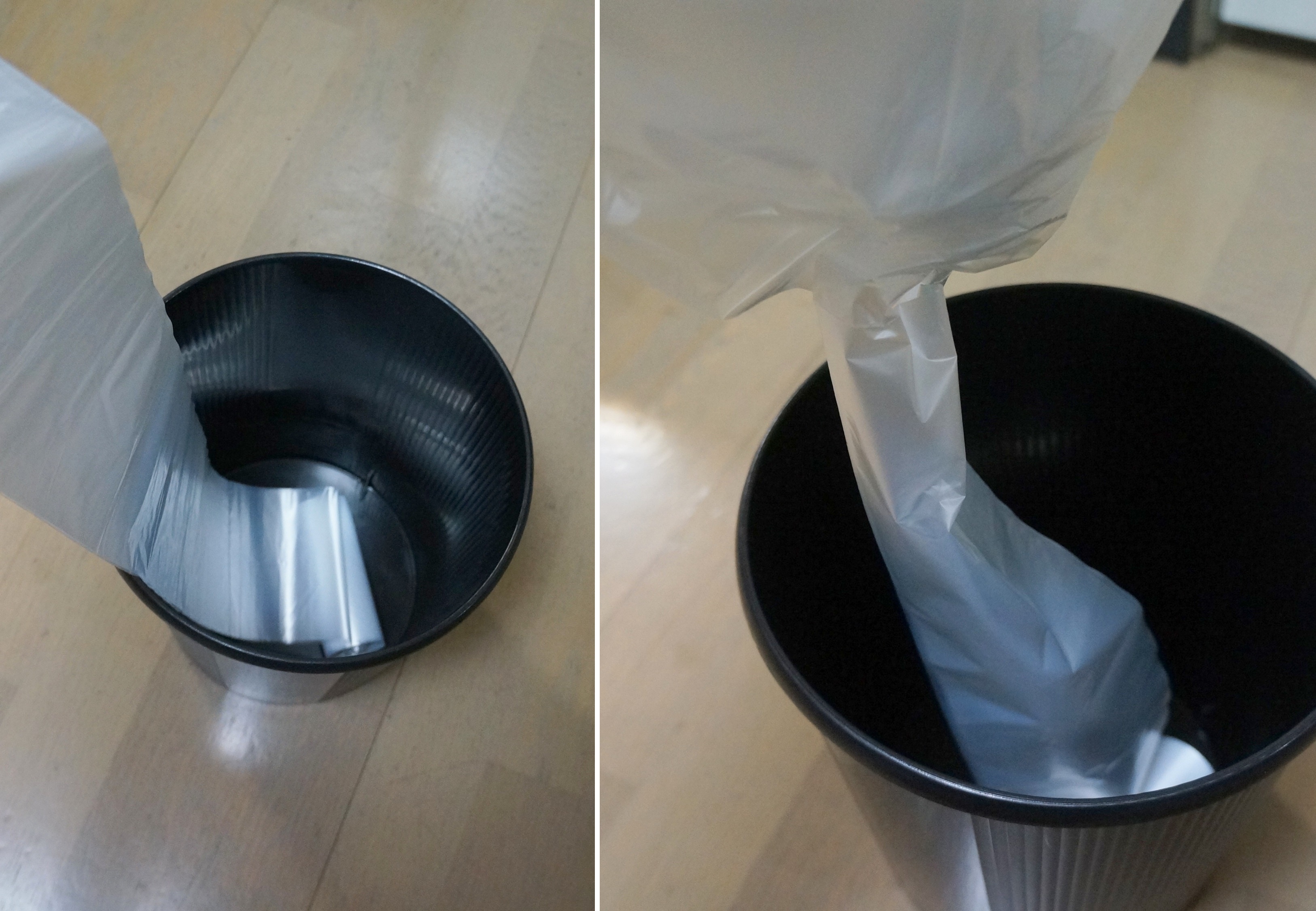 ▲ロール状のゴミ袋をゴミ箱に落とす(左)。使い終わったゴミ袋を引っ張り上げると、次のゴミ袋が持ち上がる(右)