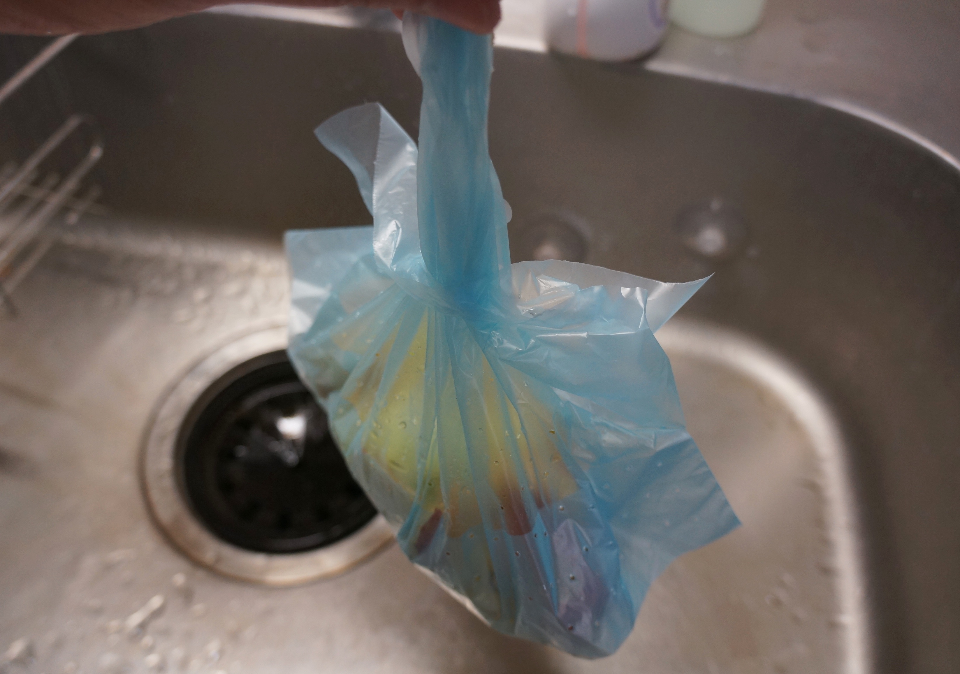 使い終わったあとは、持ち手を反対側の穴に通して口を閉じます。この穴が破けやすいのがクセモノですが、うまく通せば生ゴミを極力触れずに “封印”できます。