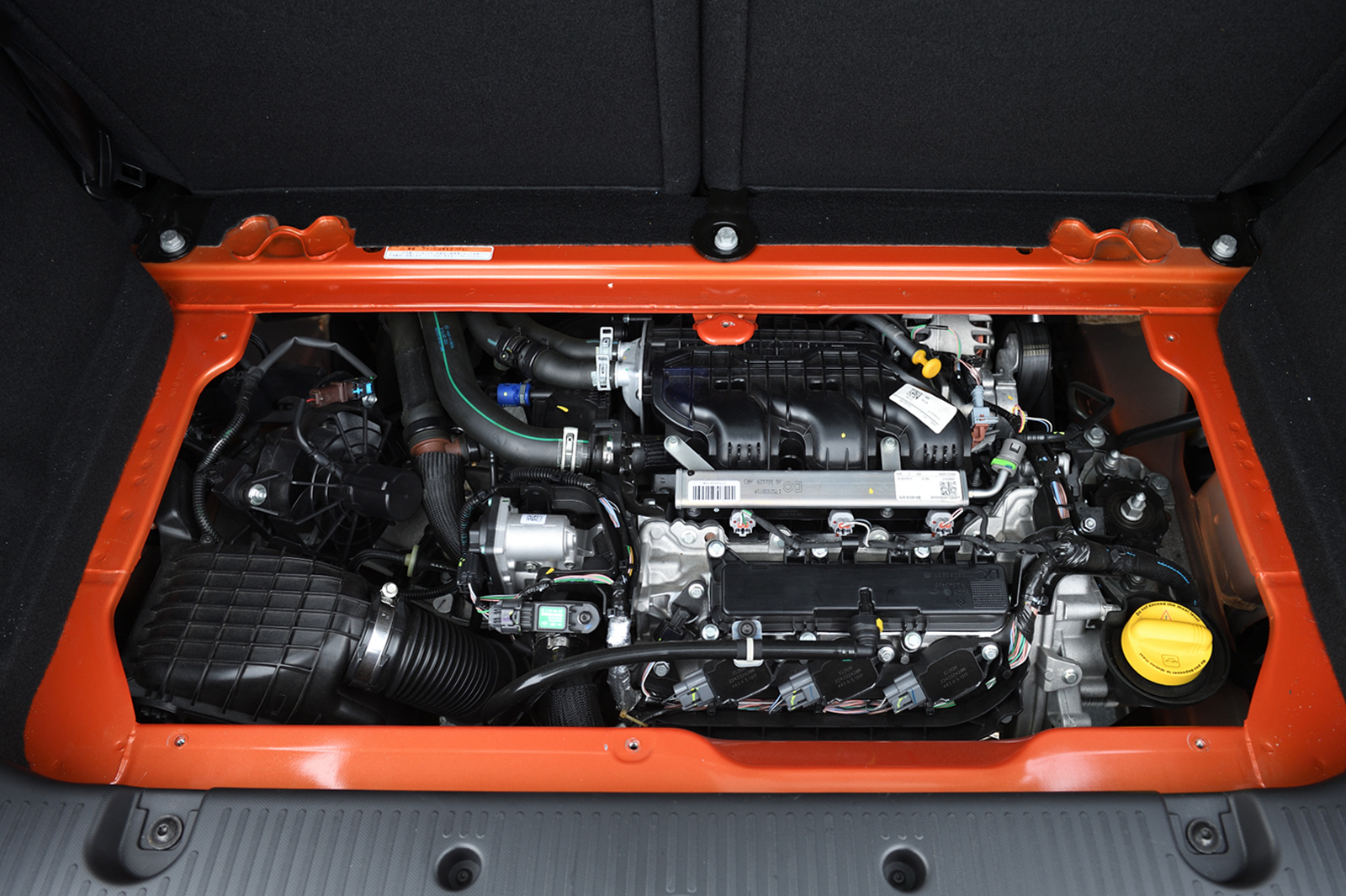 全長3630mm、全幅1660mm、全高1545mmというボディサイズ、1010kgという車重はベースモデルとほぼ共通。しかし、リアのラゲッジスペース下に搭載されるエンジンは「ゼン EDC」や「インテンス」といったノーマルグレードに搭載される排気量897ccの直列3気筒DOHCターボをベースに、最高出力を90馬力から109馬力へと大幅にアップしています。