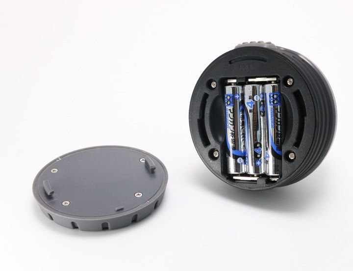 電池は底の部分を捻ると開きます。非常に簡単かつスピーディーな開閉が可能です。見たところOリングなどのパッキンはありません。ただ、メーカーサイトでは防滴の記述があるので、雨に濡れる程度では問題ないと思います。おそらくこの製品はテント内で使用されるランタンなので、必要以上に防水性を高めていません。蓋の開け閉めや価格を考えると、これで充分かと思います。
