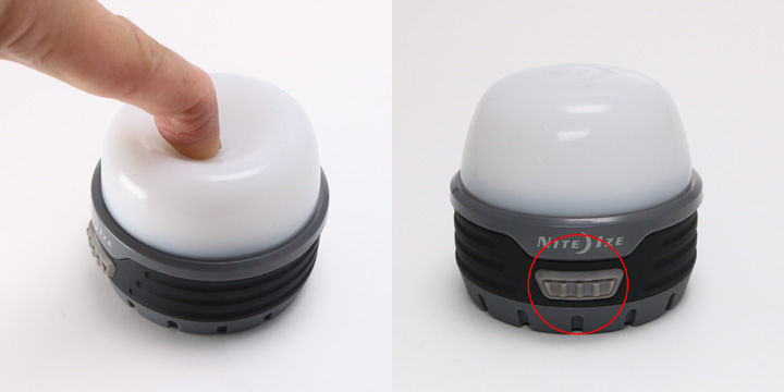 セードは樹脂製ですが、とても柔らかい素材です。触感は子供の頃遊んだゴムボール。郷愁を誘う柔らかさです。昔、GENTOSでタッチボタン式の似たようなランタンがありましたが、あちらは固い樹脂でした。この部分を押して点灯させたくなるのが性ですが、実際のスイッチはボディサイドのプッシュボタン(赤丸の部分)。スイッチはやや硬め。理由は誤点灯防止です。