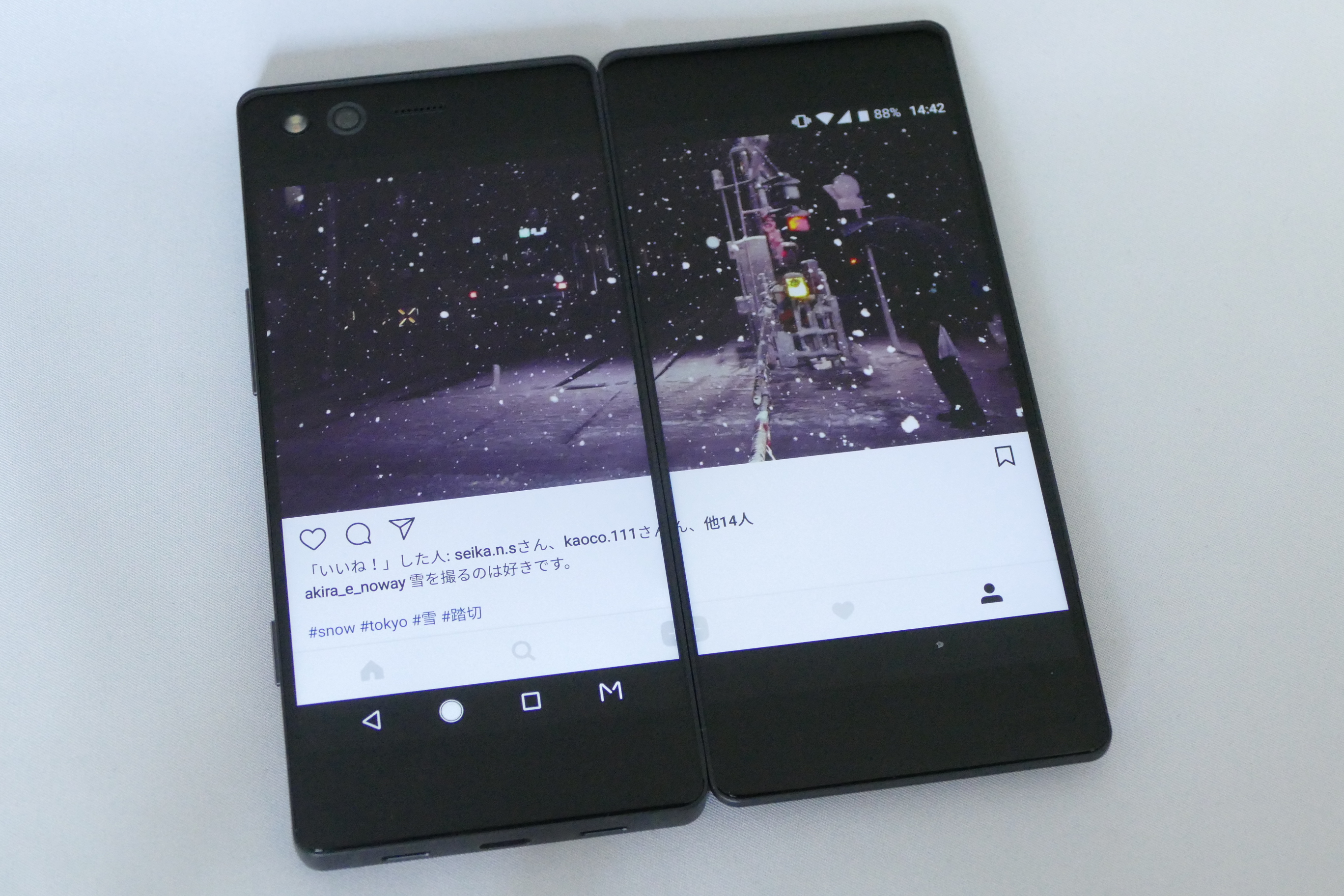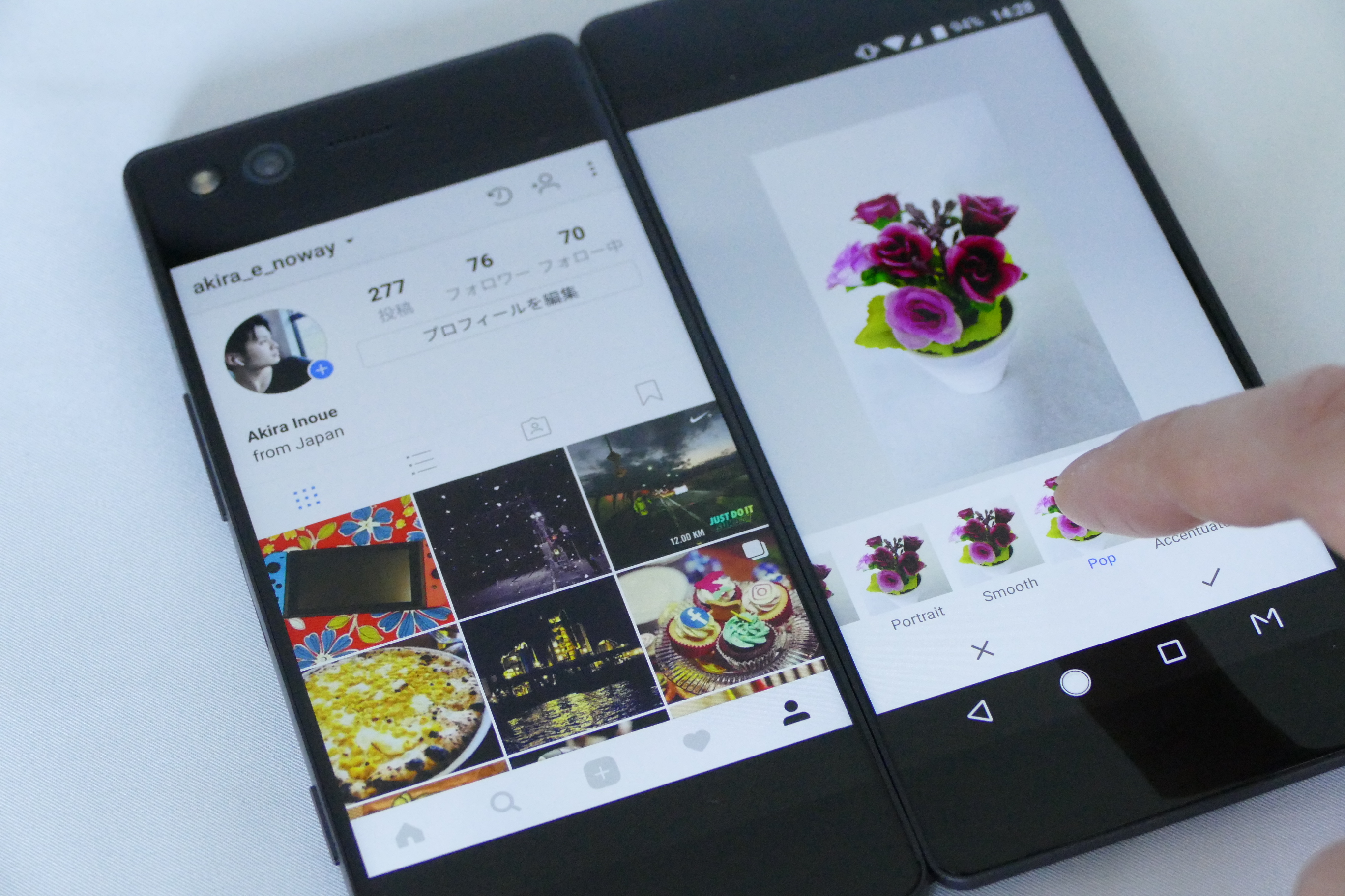 続いて、2枚の画面でそれぞれ別のアプリを起動する場合には、ふたつのアプリを同時に使用できます。例えば、片方の画面で写真を編集して、もう片方の画面でSNSに投稿するといった使い方。