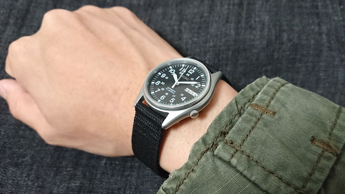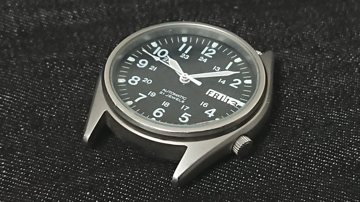 ケースサイズはやや小ぶりで幅約35ミリ。デザインは視認性の良い黒地に白文字、実用一辺倒を地で行く腕時計です。ちなみに名前に“ミリタリー”と冠されていますが、腕時計業界によくある“ミリタリー風”腕時計であって、「○○の軍隊に採用された!」なんてモノではありません。