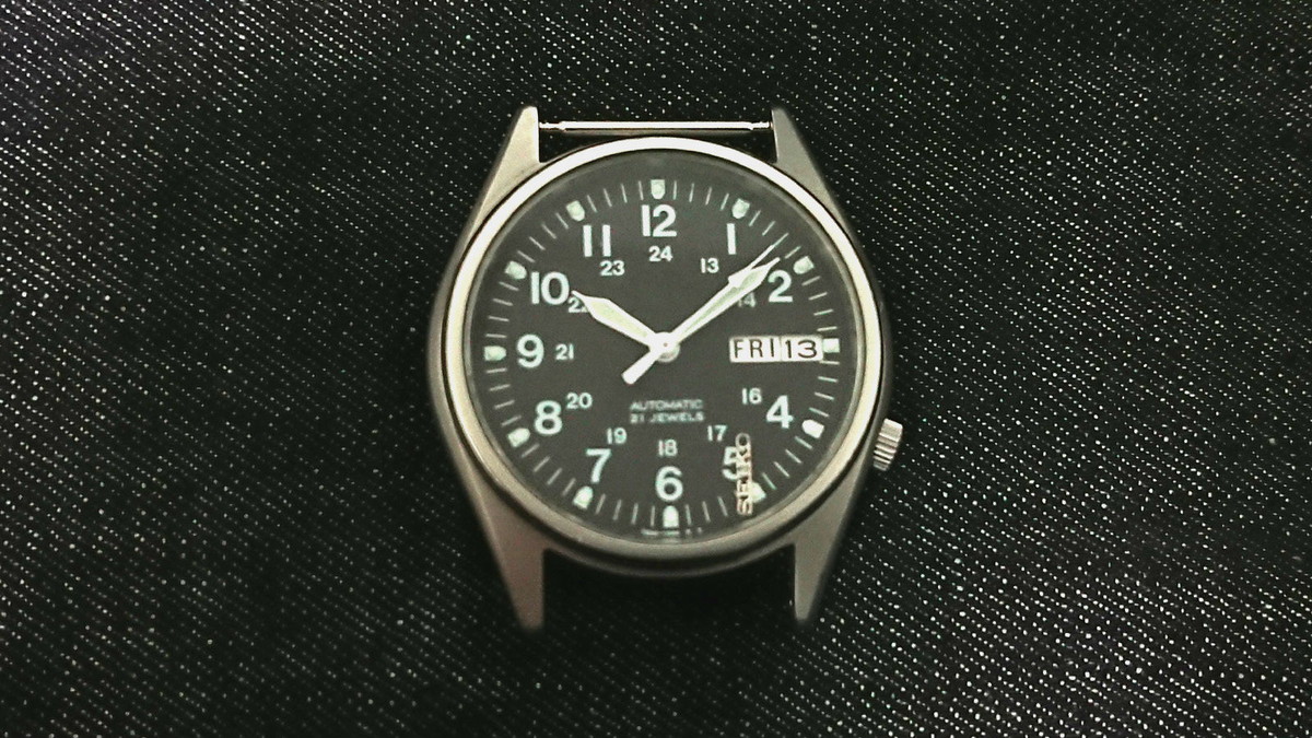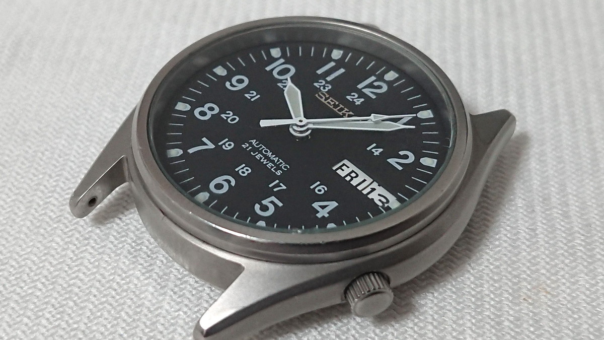 普遍的&定番デザインで、現在でもそれなりに人気も高く、古い機種ですが状態次第では1万以上の価格で取引されることもあります。私が落札したのは“訳あり品”で、稼働はするものの文字盤の「SEIKO」ロゴが剥がれていて、風防にも小キズが多数。こんな状態なので、相場より安めの5162円(送料込み)で落札となりました。