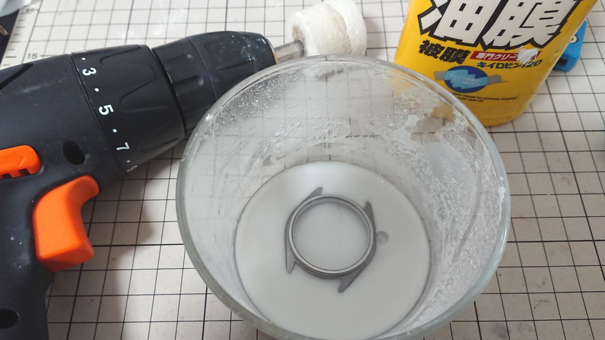 仕上げは酸化セリウムの入った「キイロビン」を水に溶かして、ひたすら電動でバフ掛け! ココでも数時間、研磨研磨。もう精神修行ですね、コレ。数日に分けて夜な夜な研磨していましたが、“ながら”で観ていたアニメは全12話分、観終えてしまいました(笑)。