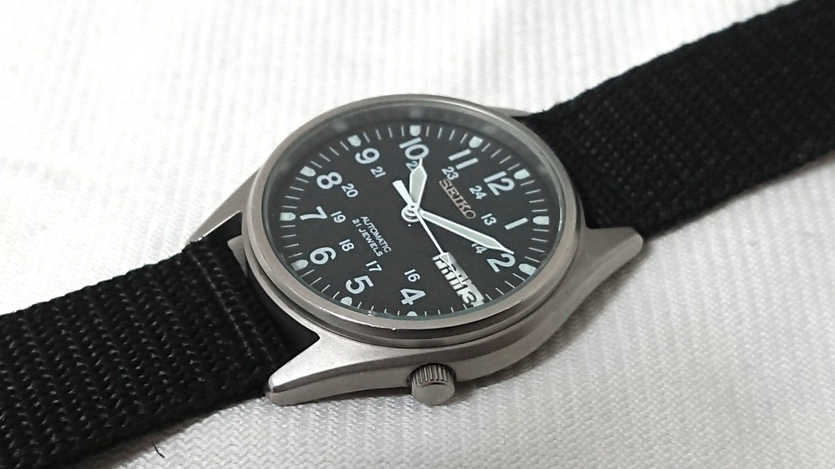 古き良き機械式ミルスペックを模した「SKX427」。ムーブメントはセイコー5などでおなじみの7S系が使われていて、手巻き&秒針規制機能がなく、自動巻きのみで動きます。