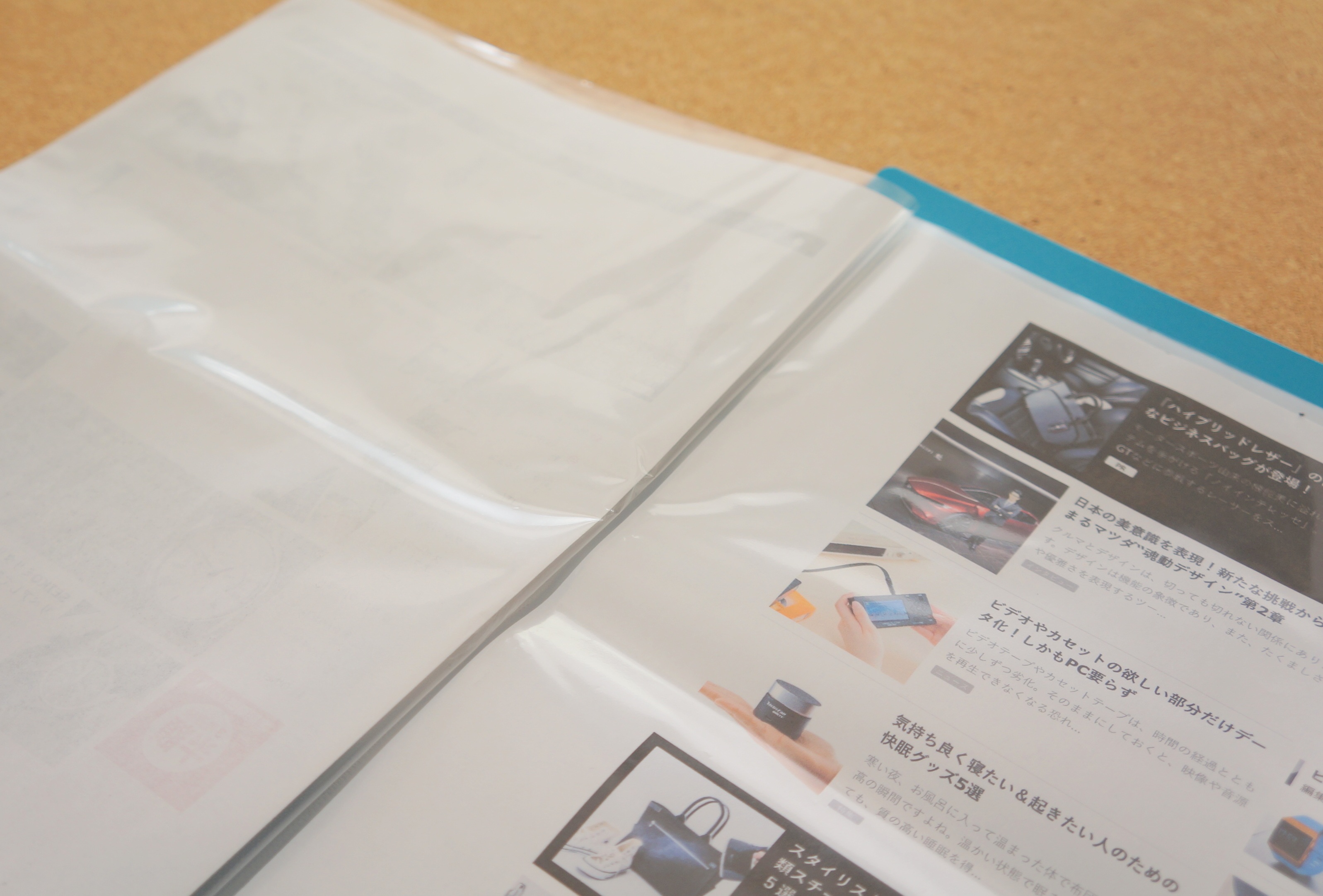 ファイルを折りたたんでみましたが、なかの書類にはクセが付くだけで、目立った折り目は付きませんでした。これなら、上から重しをしてしばらく放置すれば元に近い状態に戻りそうです。もっとも、ファイルを上から強く押した場合は、折り目がついてしまいますが。