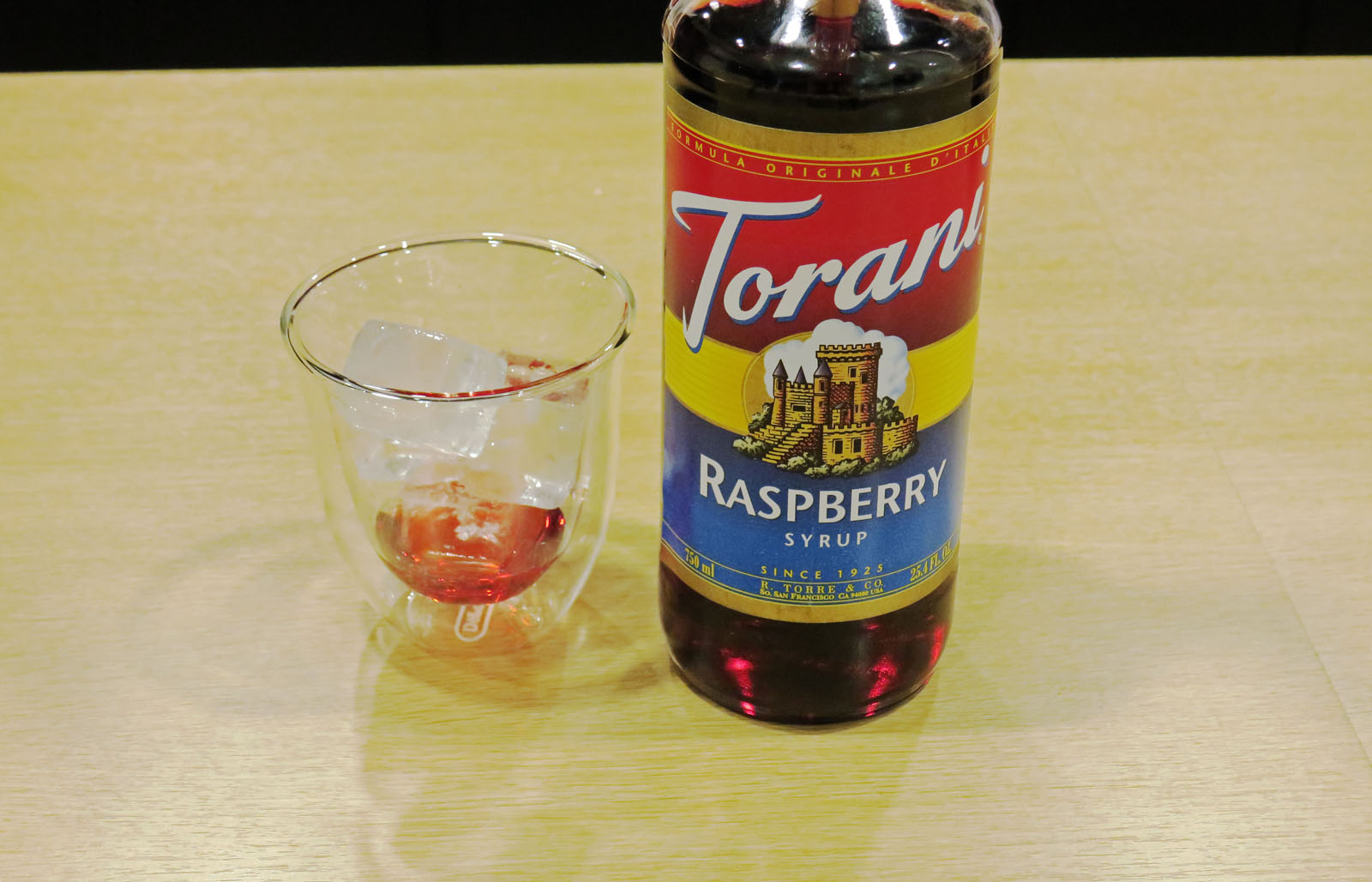 ①グラスに氷とシロップ約25ccを注ぎます。今回はフランボワーズを使いました。シロップは何種類もあるので好みで選ぶのもいいですね。