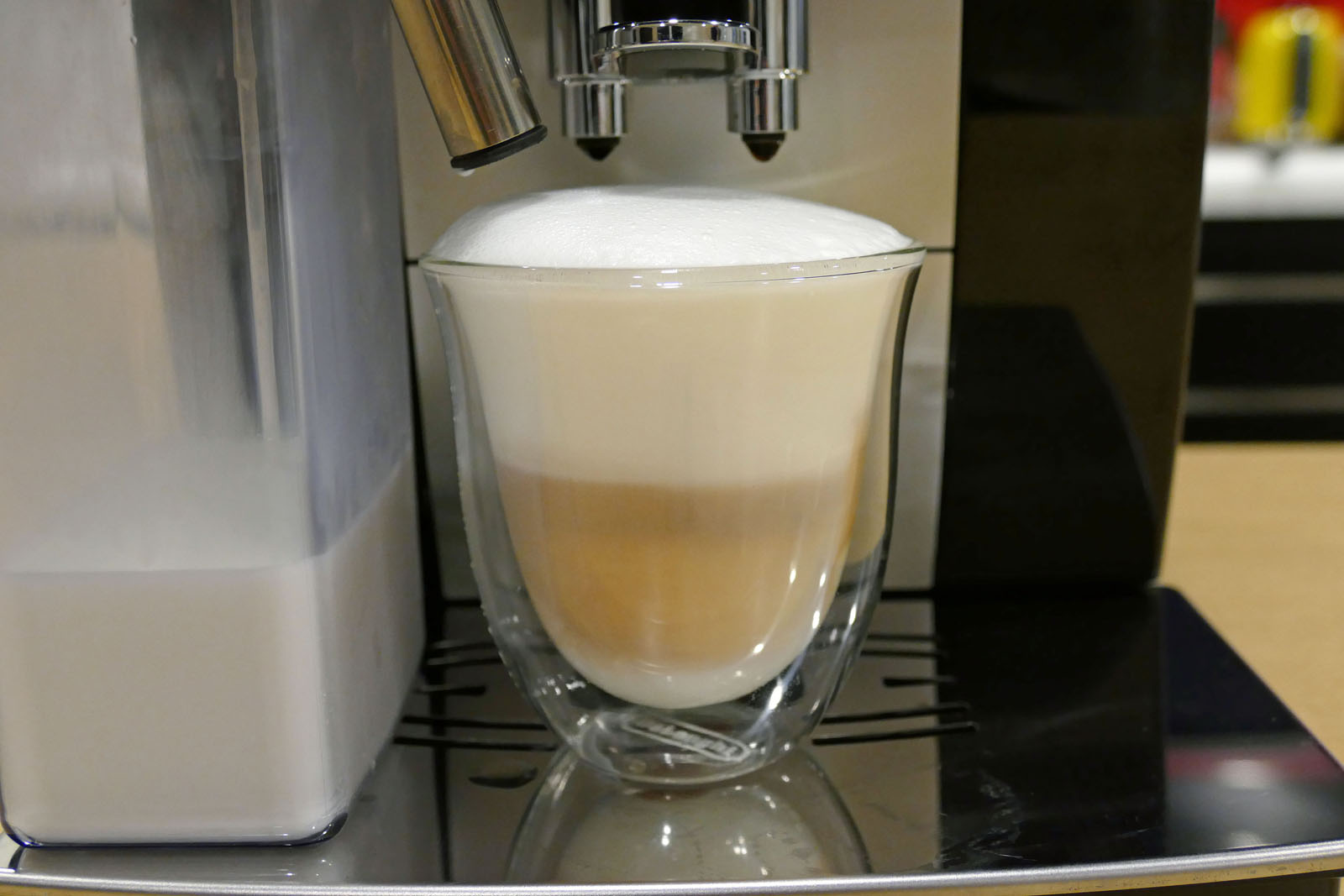 ①マシンの「ラテクレマ™機能」を使って、きめ細かい泡のカプチーノを淹れました。牛乳を入れたミルクコンテナをセットすれば、あとはボタン操作のみ!