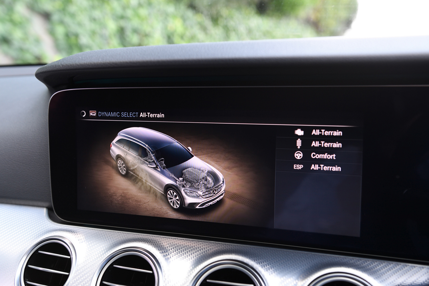 そして何より、印象に残ったのは、オールテレインの肝である“エアボディコントロールサスペンション”と、ドライブモードを選べる“ダイナミックセレクト”の完成度の高さ。連続可変ダンパーとマルチチャンバーエアサスペンションを電子制御するエアボディコントロールサスペンションそのものは「E400 4マチック ステーションワゴン エクスクルーシブ」やAMG系モデルにも採用されていますが、オールテレインは専用のセッティングとされています。