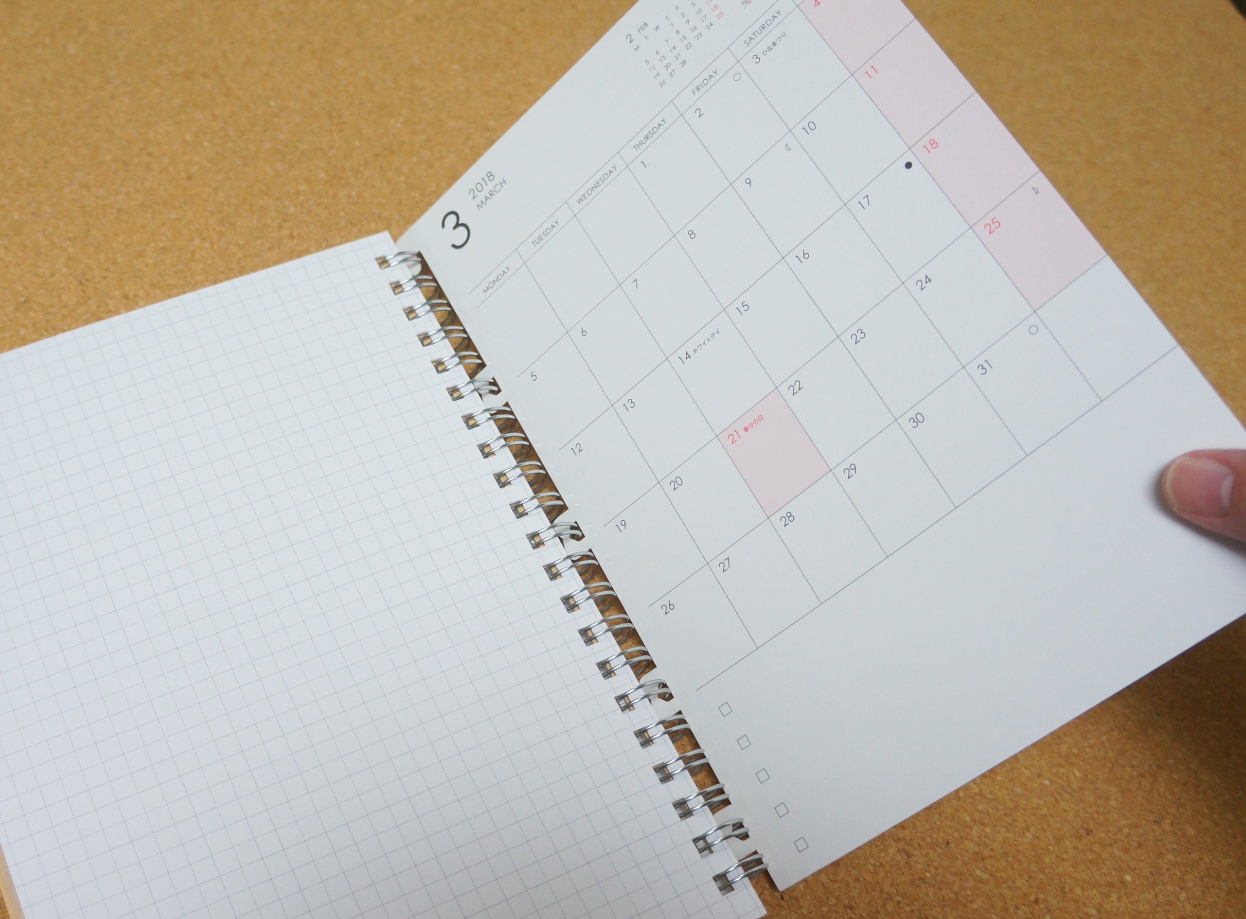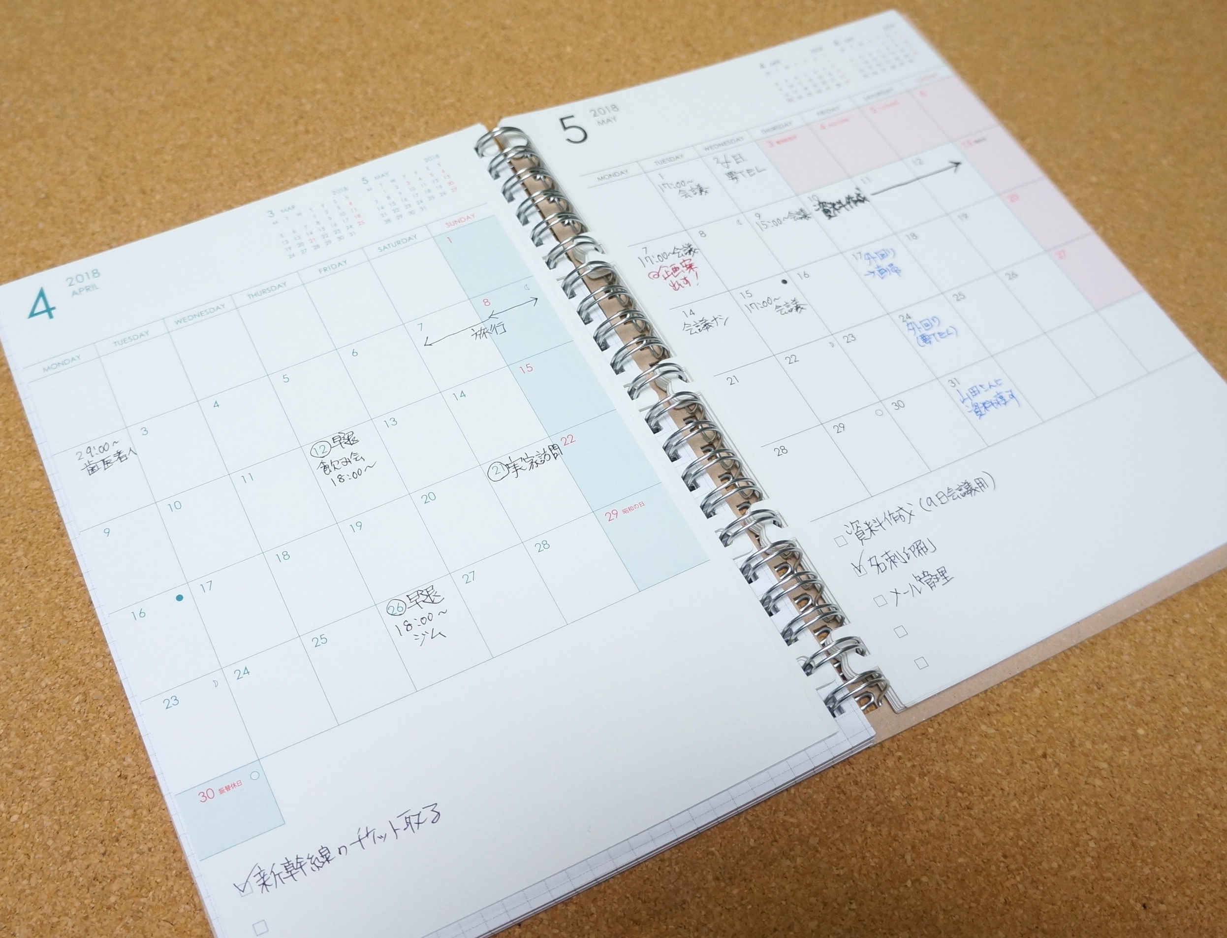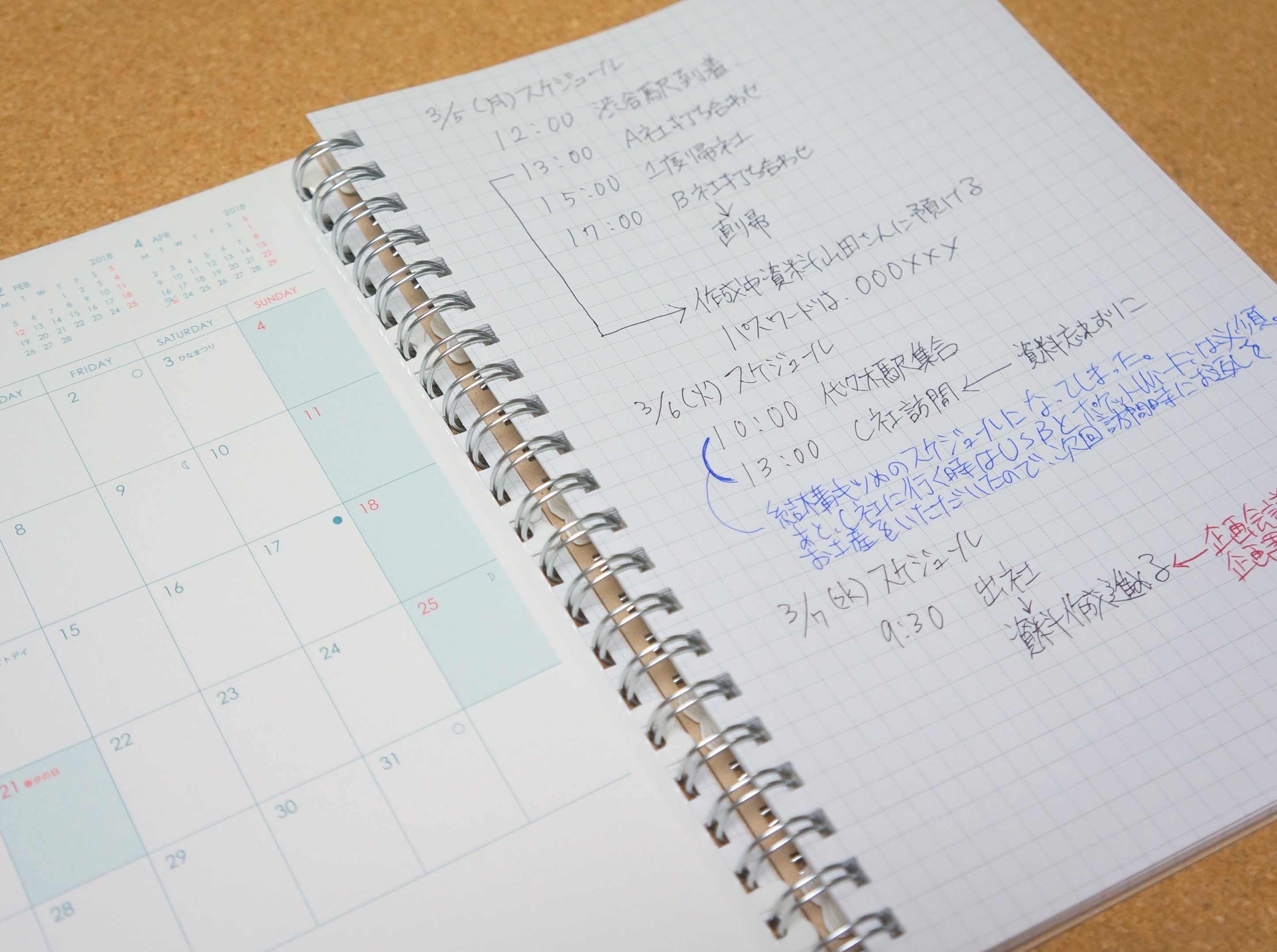 表紙はかっちりしたボール紙で、立ったままでも筆記がしやすいのも魅力のひとつ。ただ、バンドがついていないので、落としたりカバンのなかに入れたりしていると、ページがバラバラになってしまいます。カレンダーをすべて入れると普通のノートより厚みが出るので、本体とは別にバンドを買って留めておくのもアリですよね。