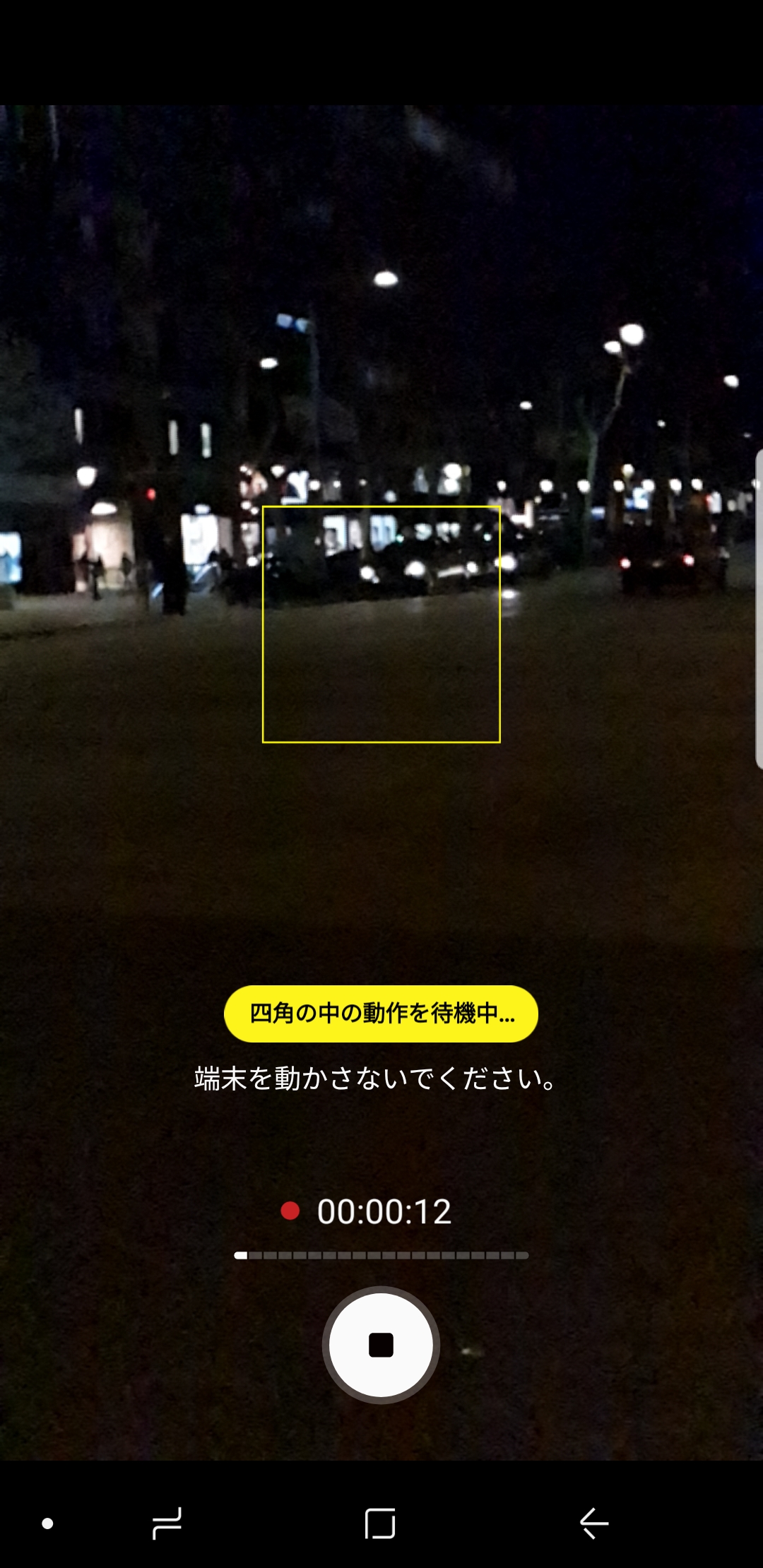 デフォルトでは、被写体の動きを自動で検知したタイミングでスローモーションが適用されます。端末をしっかりと固定して持ち、画面の中央に表示された四角に被写体が収まるのを待ちます。動きが検知されると、スーパースローモーションで撮影されたことが画面上に通知されます。
