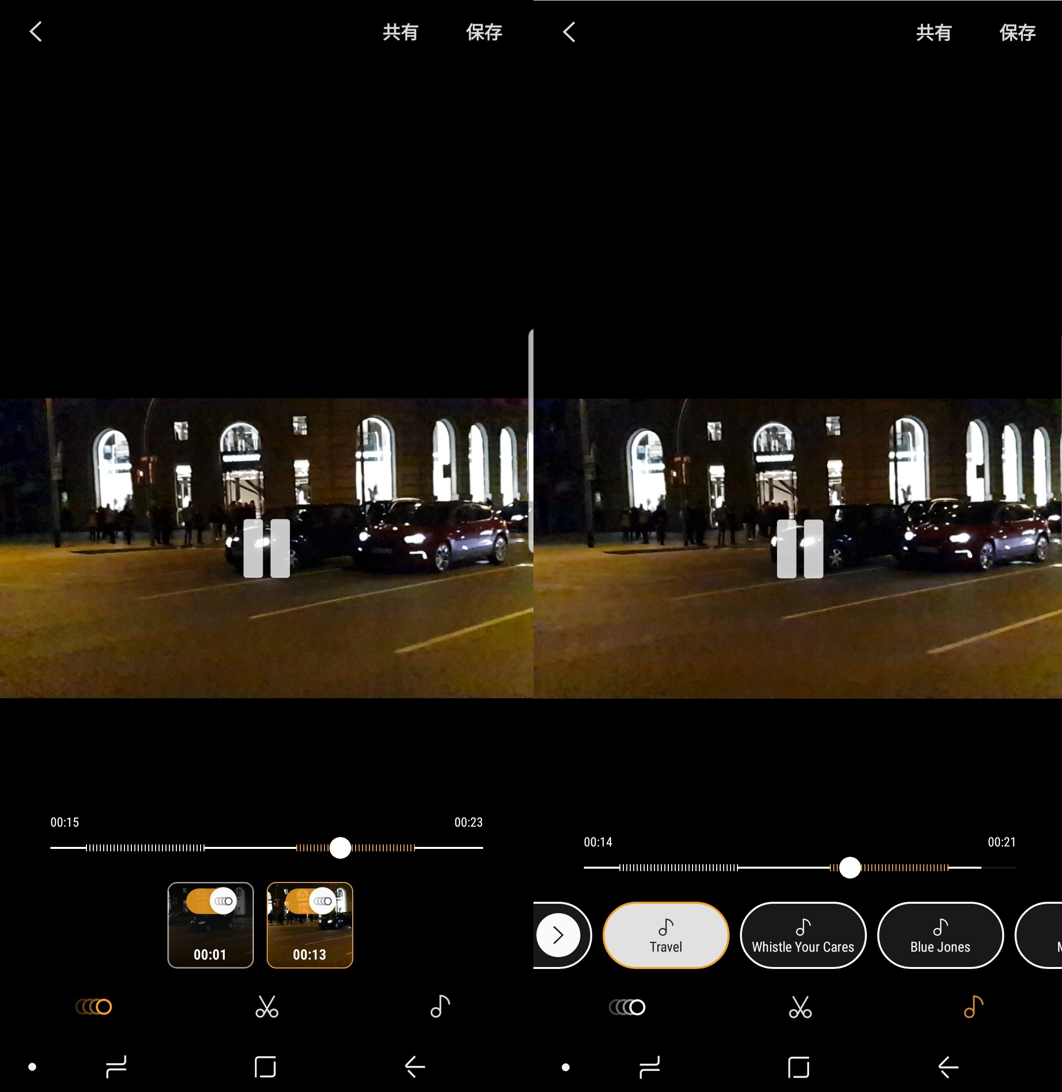 ▲スーパースローモーションで撮影した動画を「ギャラリー」アプリで編集。下部のタブを選択して、左画面では、スローモーションを有効にする部分、右画面ではBGMの選曲を行う場面だ。画面右上の「保存」をタップすると編集後のデータが保存される