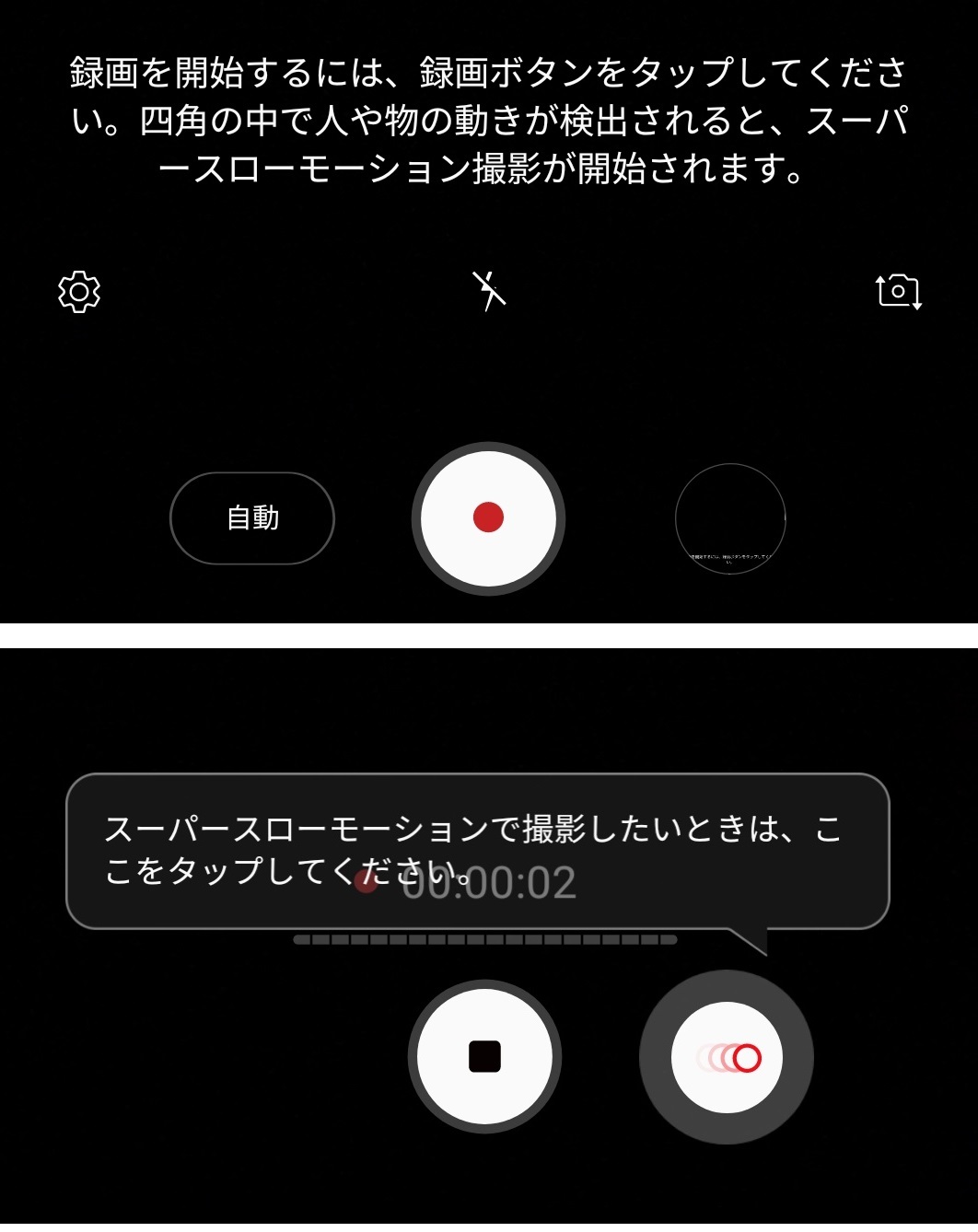 ▲上が「自動」を選択した場合。下が「自動」をタップして、「手動」に切り替えて撮影する場合。後者はスローモーション撮影の開始ボタンをタップしてから1秒程度がスローモーションとなる