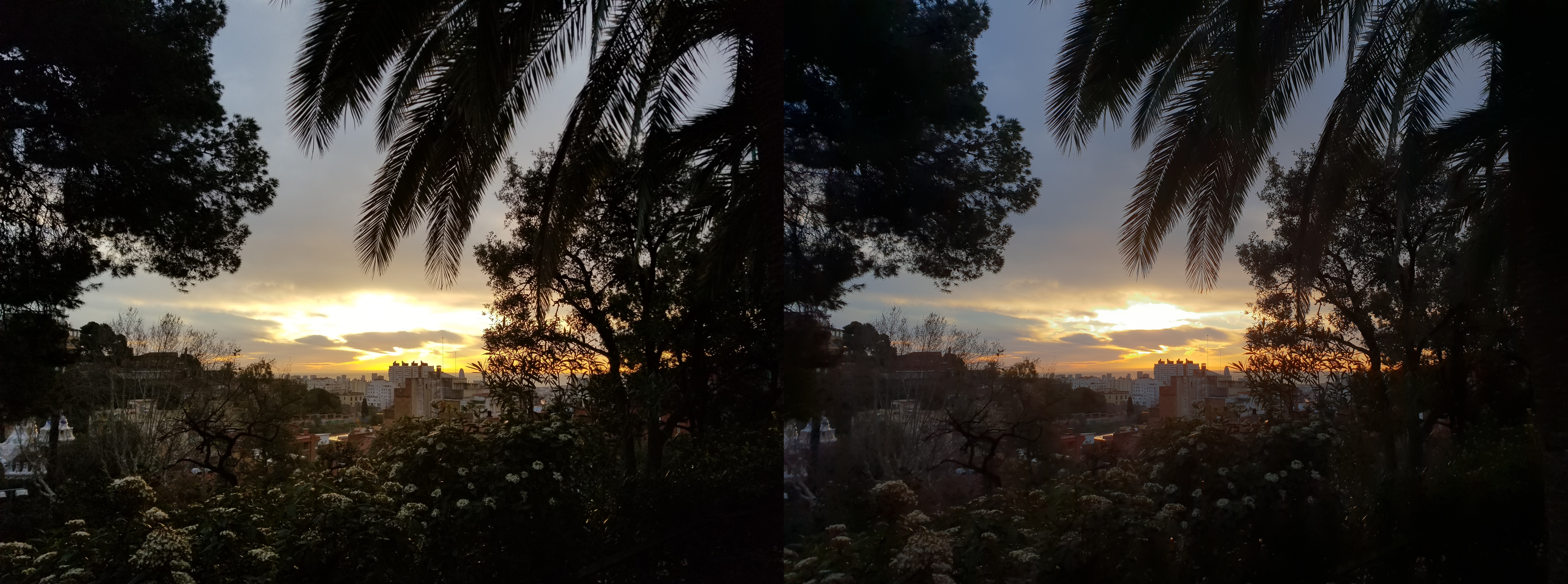 ▲S8(左)とS9+(右)で撮影(以下、同順)。F1.7のS8のカメラでも暗く沈んでしまったビルの壁面が、F1.5のS9+では視認できる明るさで撮れているのがわかる