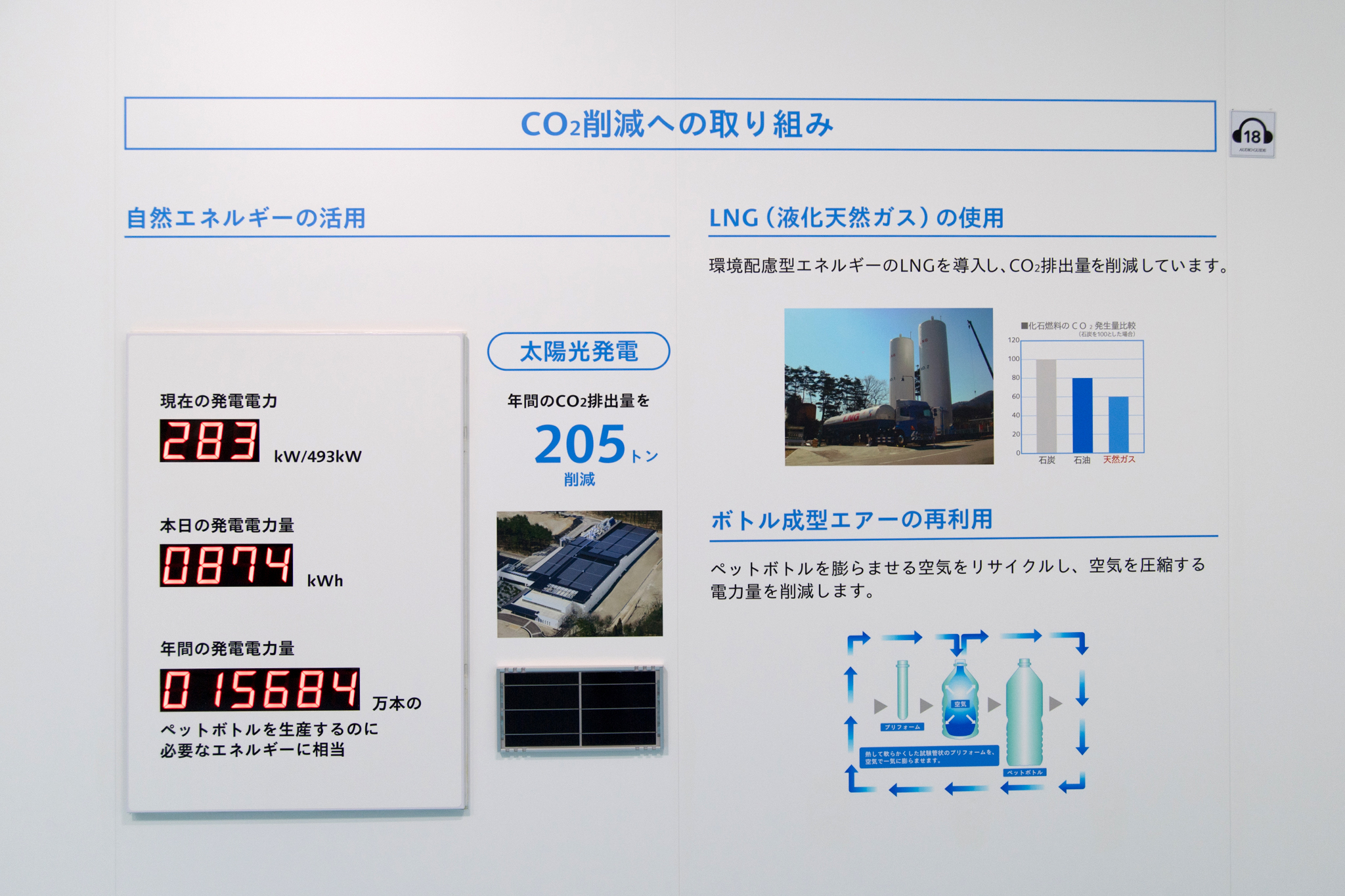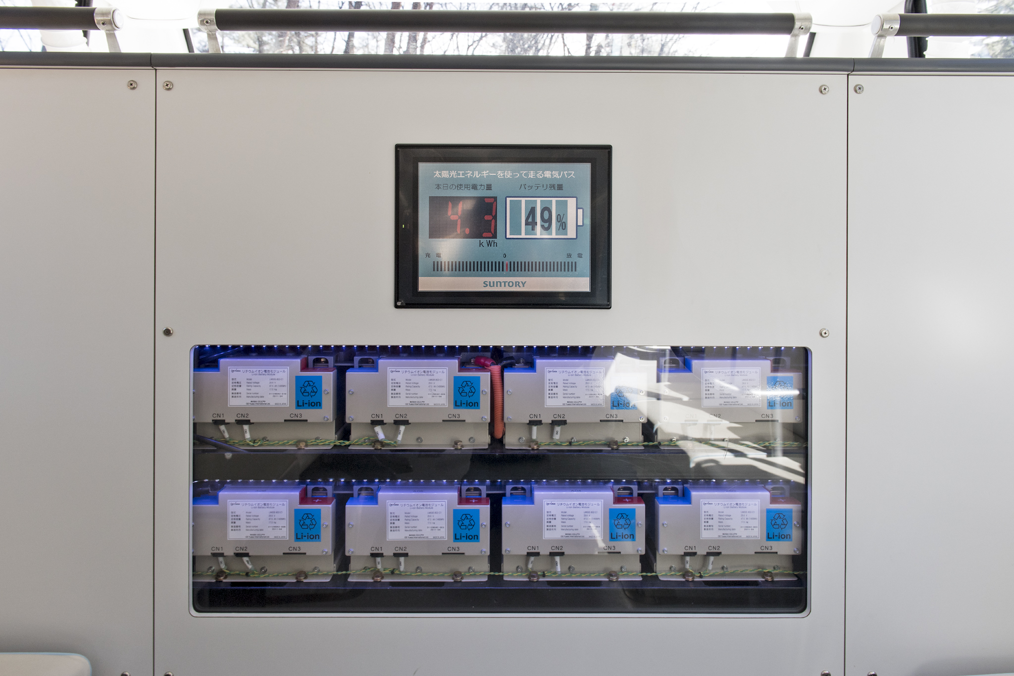 それにしてもなぜ、こちらの工場を訪れたのでしょうか? 実はサントリーでは、工場の敷地内を走るバスに、二酸化炭素を排出しない電気バスを利用しているから。リーフで行くクルマ旅らしく、EVつながりだったのです。電気バスには、リチウムイオンバッテリーが24個搭載され、使われる電気は、工場の屋根に設置されたソーラーパネルで発電・供給しています。ちなみに、工場で働く方々が着ている防塵服には、1着当たり26本分のペットボトルをリサイクルした素材が使われるなど、徹底してエコを意識した工場です。