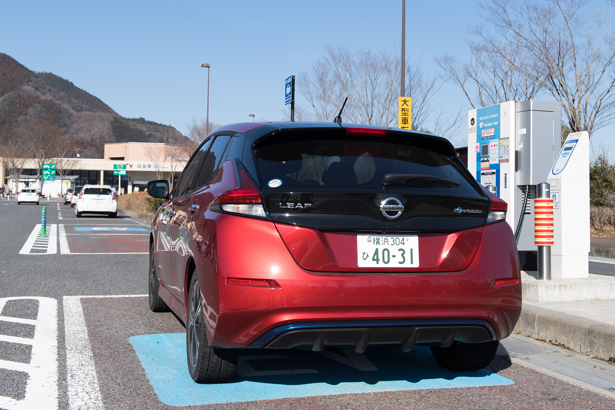 工場見学を楽しんだ後は、近くにある道の駅で急速充電していたリーフをピックアップし、帰路に就きます。車内はEVらしく静かなので、スタッフたちと会話をしながらドライブを楽しみます。そして、途中の談合坂サービスエリアで、撮影を兼ねて追加充電。今回のように先を急がない旅ならば、充電時間をちょっとした“もぐもぐタイム”などに充てられるので、乗る人もドライブの疲れをリフレッシュできますね。