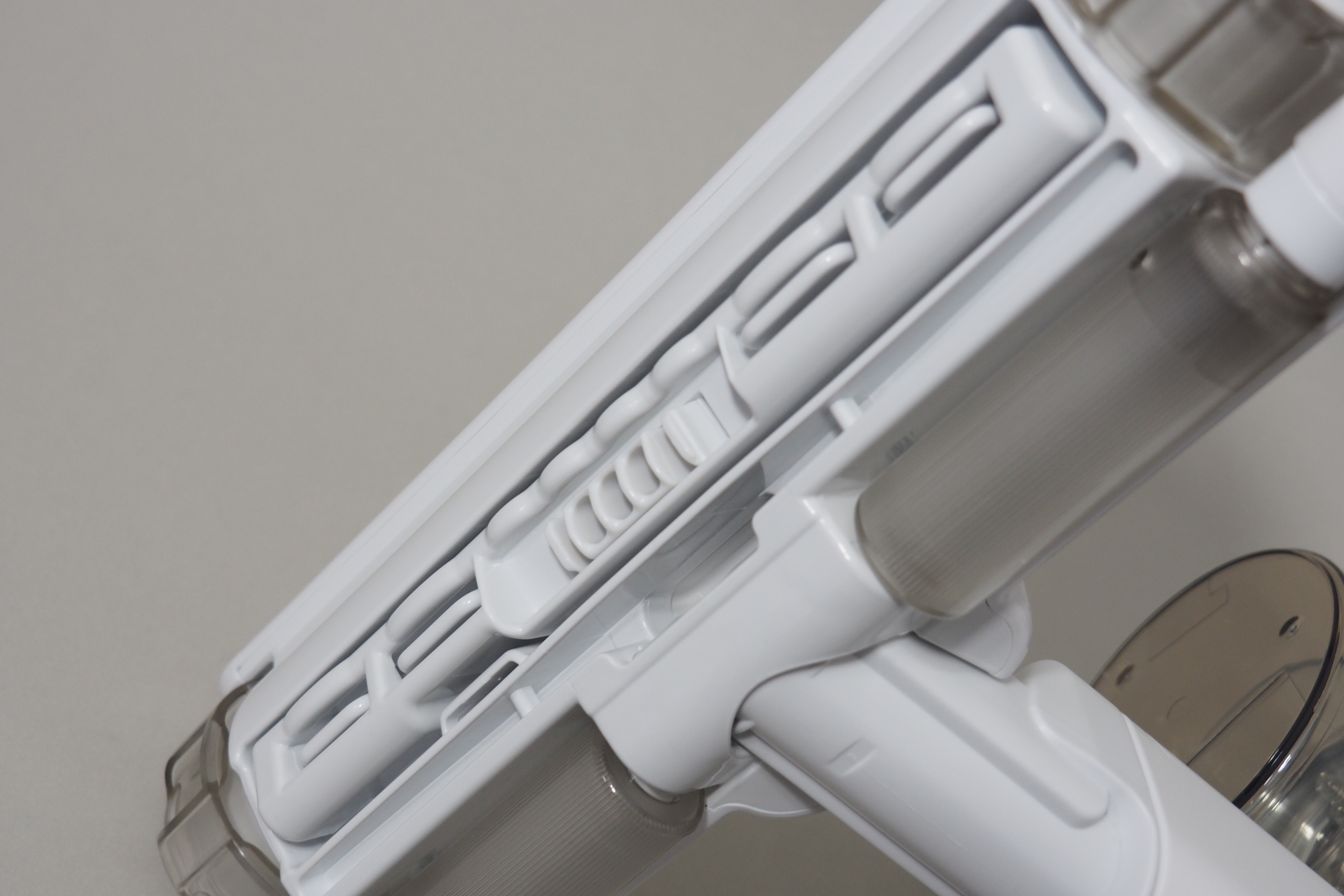 さらに、ヘッドにもハイパワーモーターを搭載しており、ふとんの奥に入り込んだ微細なゴミをワイドビーターで叩き出すことができる。このふとんを叩く機能は、他のふとん掃除機にも搭載されることが多いが、本製品は、このふとんを叩く機能をオンオフすることが可能。