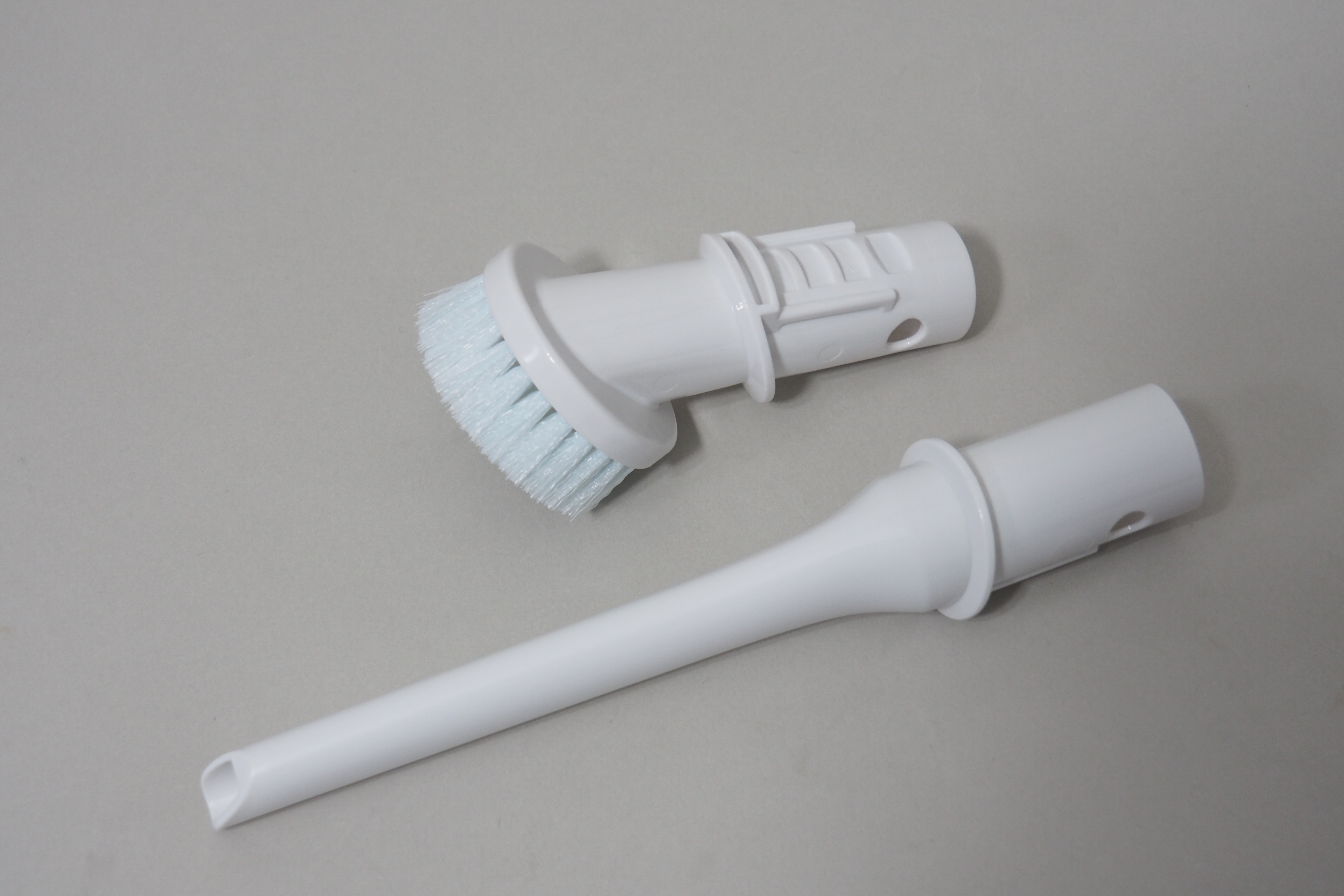 ふとん掃除用のパワービーターヘッドに加えて、隙間ノズルと丸ブラシが標準で付属しており、自宅内のちょっとしたゴミを集めるといったシーンでも利用できる。著者宅では寝室用の掃除機として、ふとんを掃除したした後にふとんを畳んだら、そのまま、床のゴミなども掃除している。ふとんを掃除するヘッドを床に使いたくない場合は、丸ブラシなどを使うといいだろう。