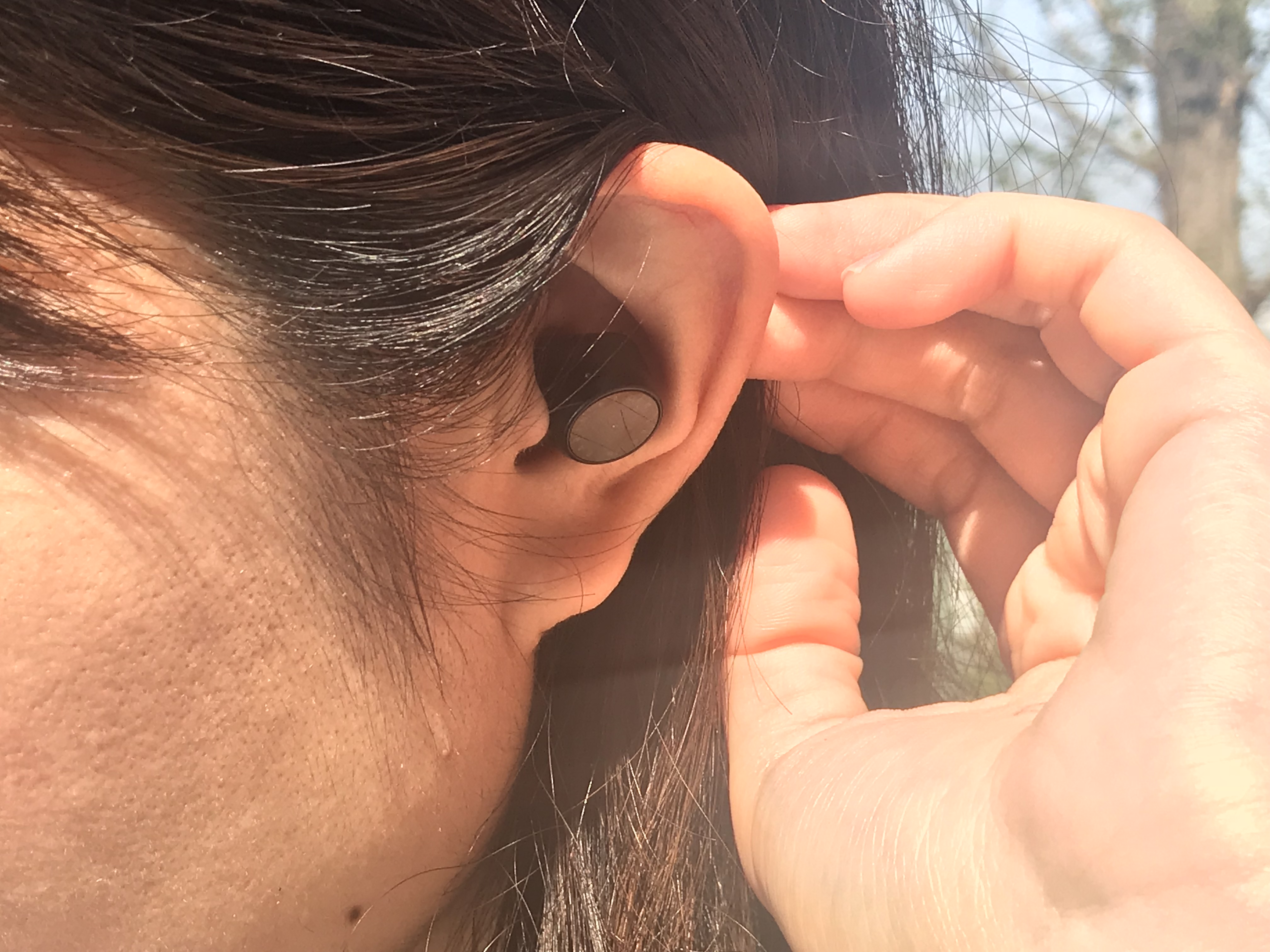 ▲イヤホンを装着した様子。標準付属のイヤーピースは低反発素材で使用するにつれて馴染む