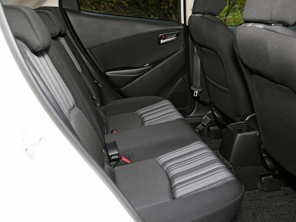 グレーと白のストライプが部分的に入った洒落たファブリックシートと、ステアリングホイールの位置を丁寧に調整すると、ピシッとした運転姿勢を取れるのがデミオの美点。自然に伸ばした足先にオルガン式のアクセルペダルが生えているのも、贅沢です。