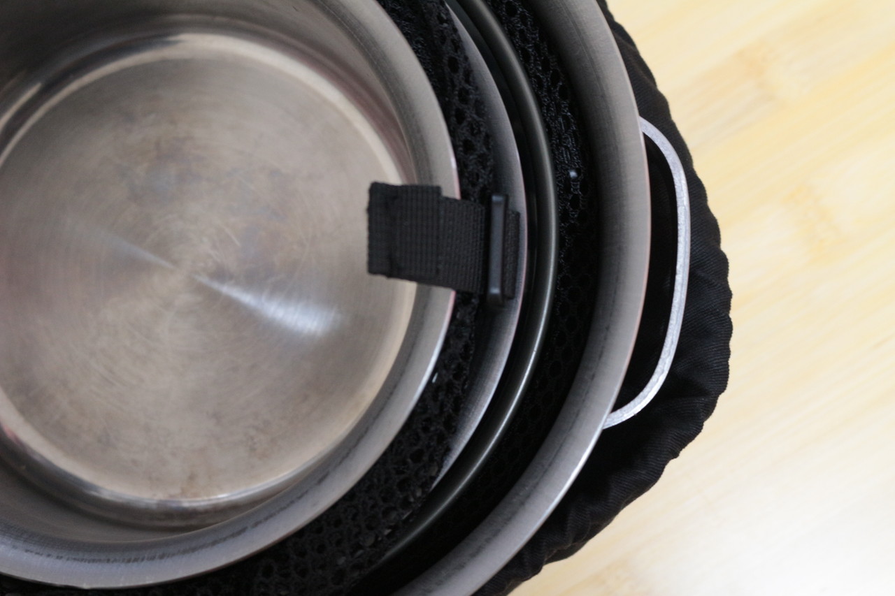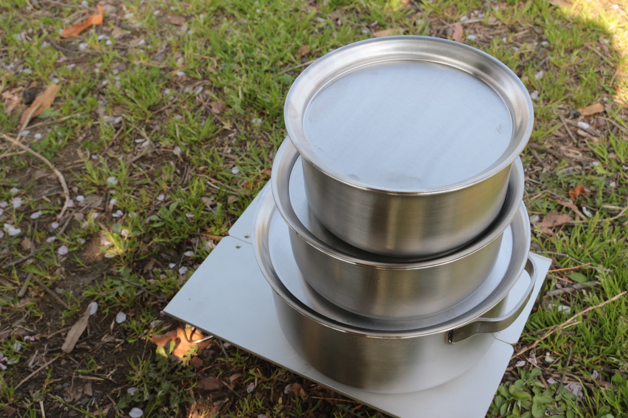 φ20cm、φ16cm、φ14cmのポットとリッド(ふた)、そしてリフターのセット。大鍋は両脇にハンドルが付いていますが、中・小鍋は取っ手がないスッキリとしたデザインで、写真のように重ねられるほか、スタッキング収納ができます。