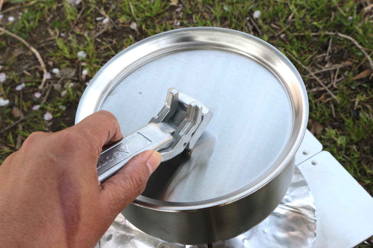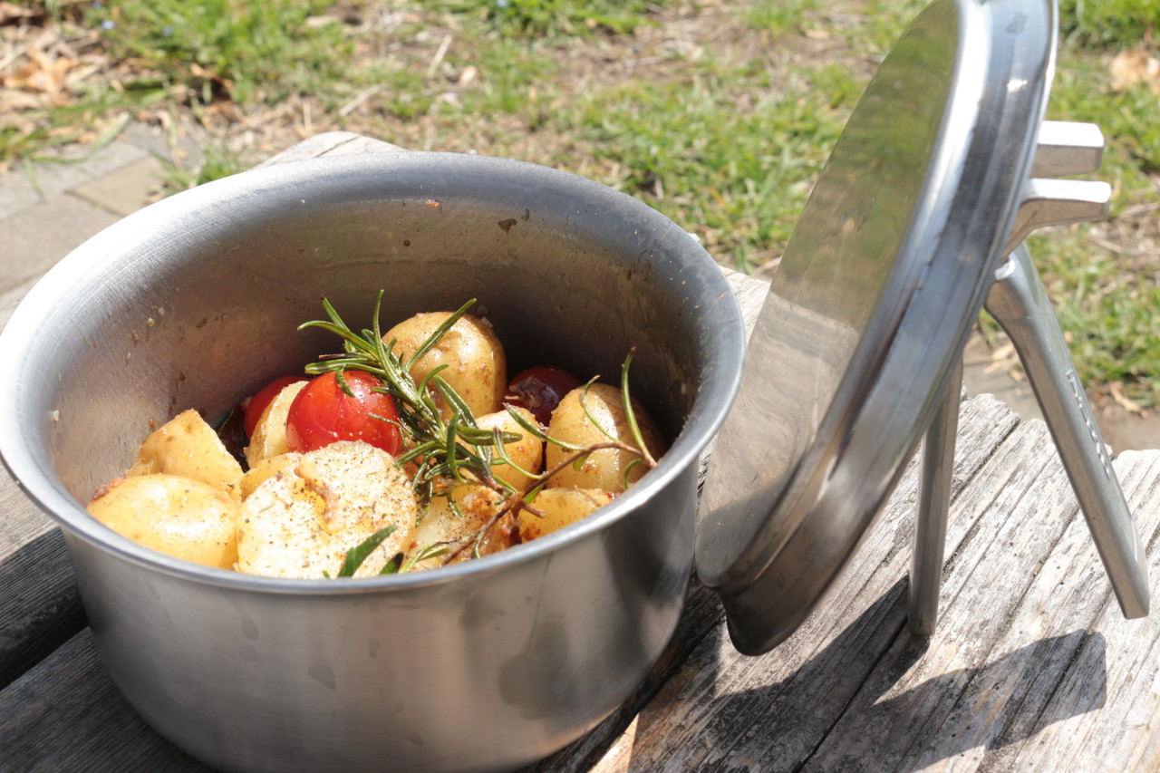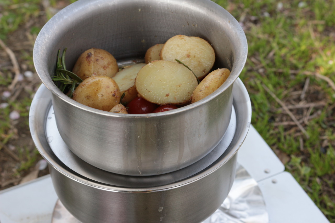 鍋を重ねられるから、できあがった料理を調理中のリッドの上に載せて保温。また、ステーキは焼き上がった後にホイルで包んで5分ほど寝かすと肉汁が落ちつくので、これも調理中のリッドの上に載せておきます。これなら寒い時期でもせっかくのステーキが冷えすぎずにすみます。