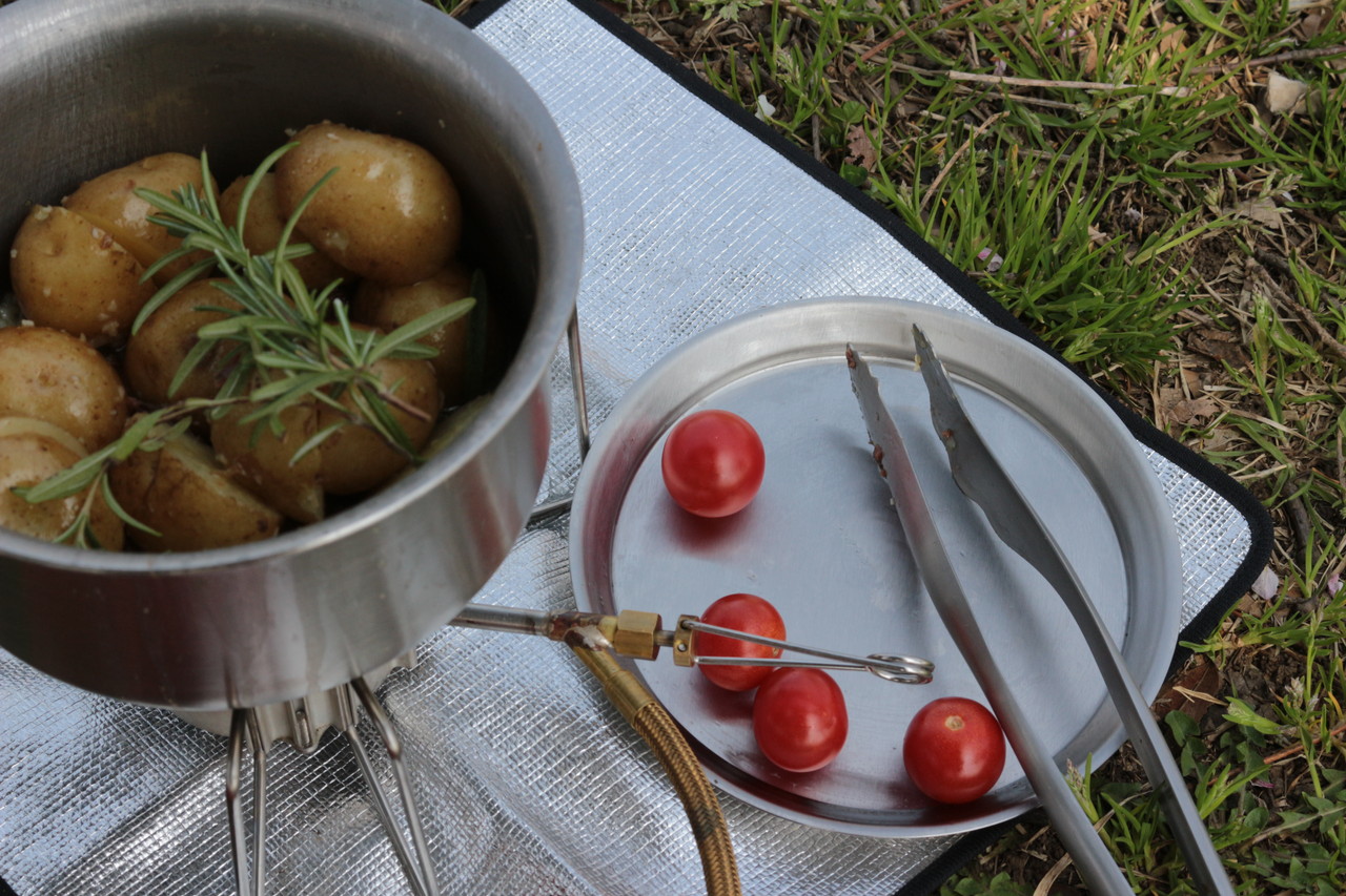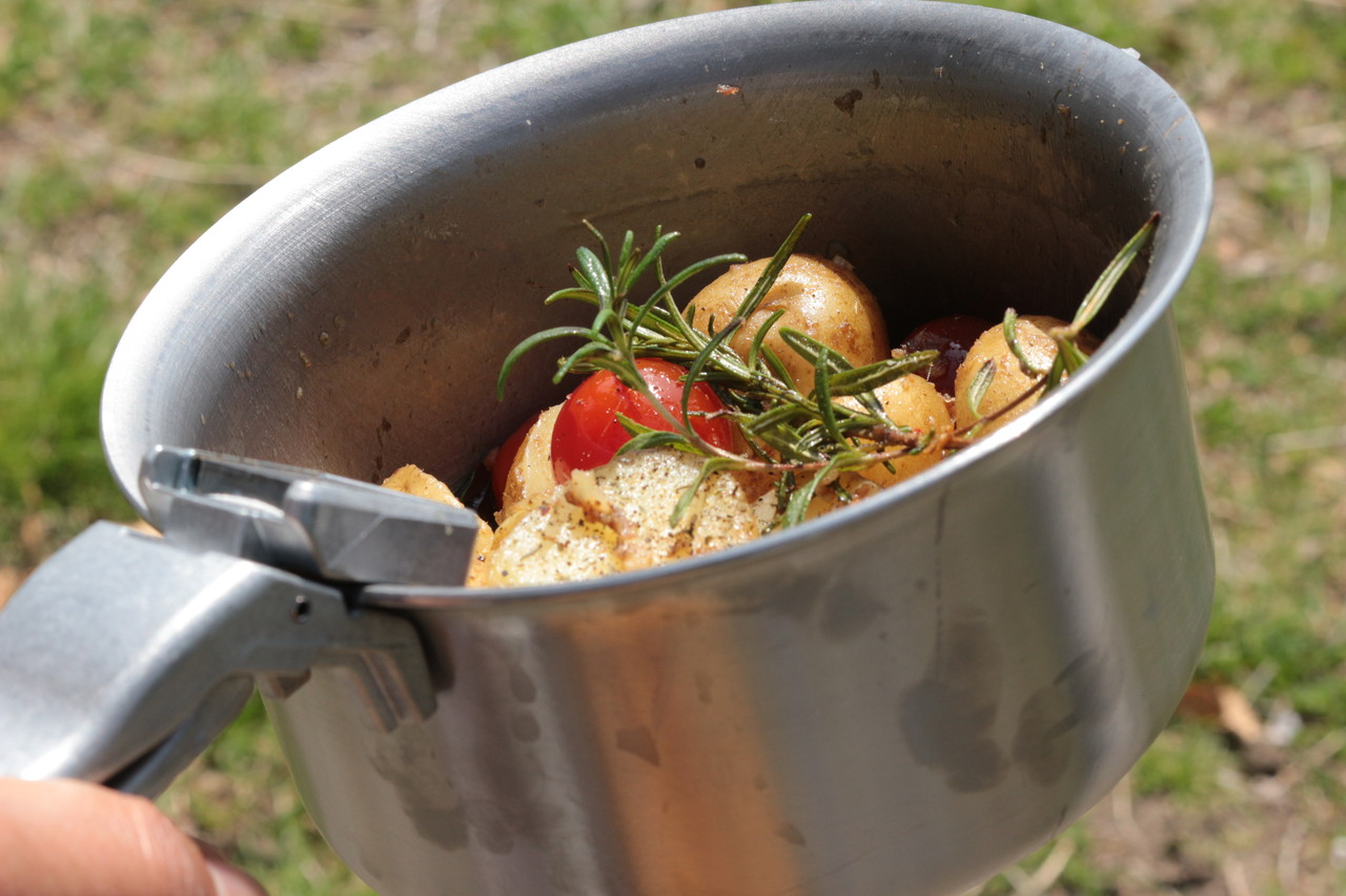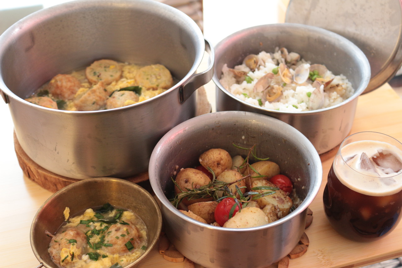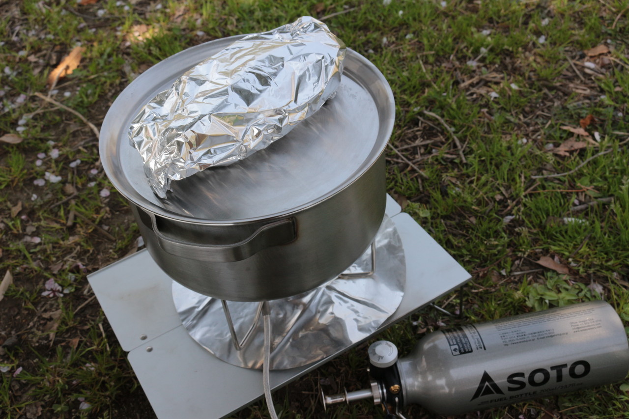 鍋を重ねられるから、できあがった料理を調理中のリッドの上に載せて保温。また、ステーキは焼き上がった後にホイルで包んで5分ほど寝かすと肉汁が落ちつくので、これも調理中のリッドの上に載せておきます。これなら寒い時期でもせっかくのステーキが冷えすぎずにすみます。