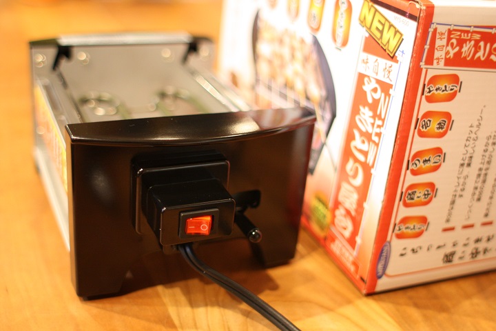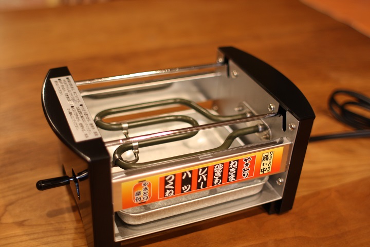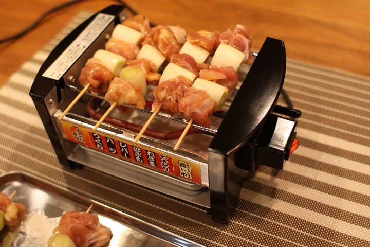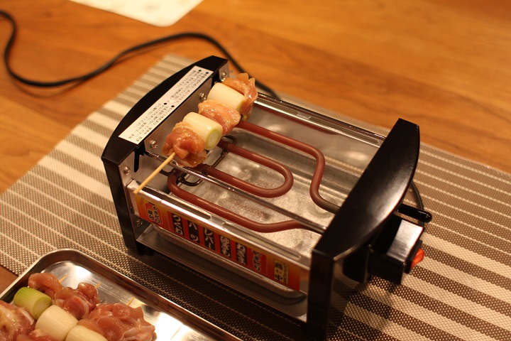 電源をオンにして3分ほど経過すると、ヒーターが熱せられ、赤くなってきました。ヒーターに食材がくっついて焦げ付いてしまわないよう、ネギマをサイドバーへ乗せます。