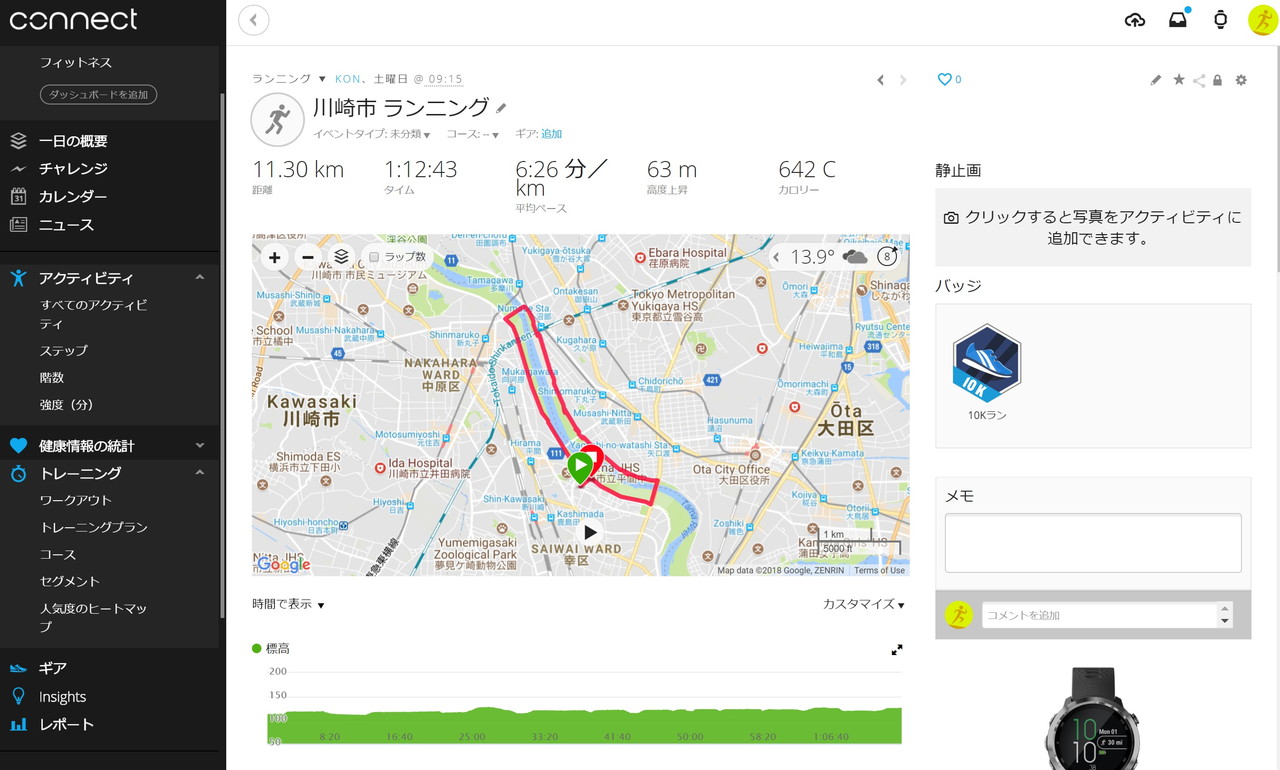 自宅近くをランニングした際のデータは、スマホアプリを通じてWebサービス「Garminconnect」にすぐにアップされる。グーグルマップにその軌跡が出るほか、高度やペースなどのデータも表示。スマホを持たずにForeAthlete 645 Musicだけで記録した場合も、走り終わったあとにあらかじめペアリングしたスマホと接続するだけで、スムーズにデータ転送が可能だ。走った距離がたまっていくのを眺めているのは、お金がたまっていく貯金通帳を見ているみたいで何だか楽しい。