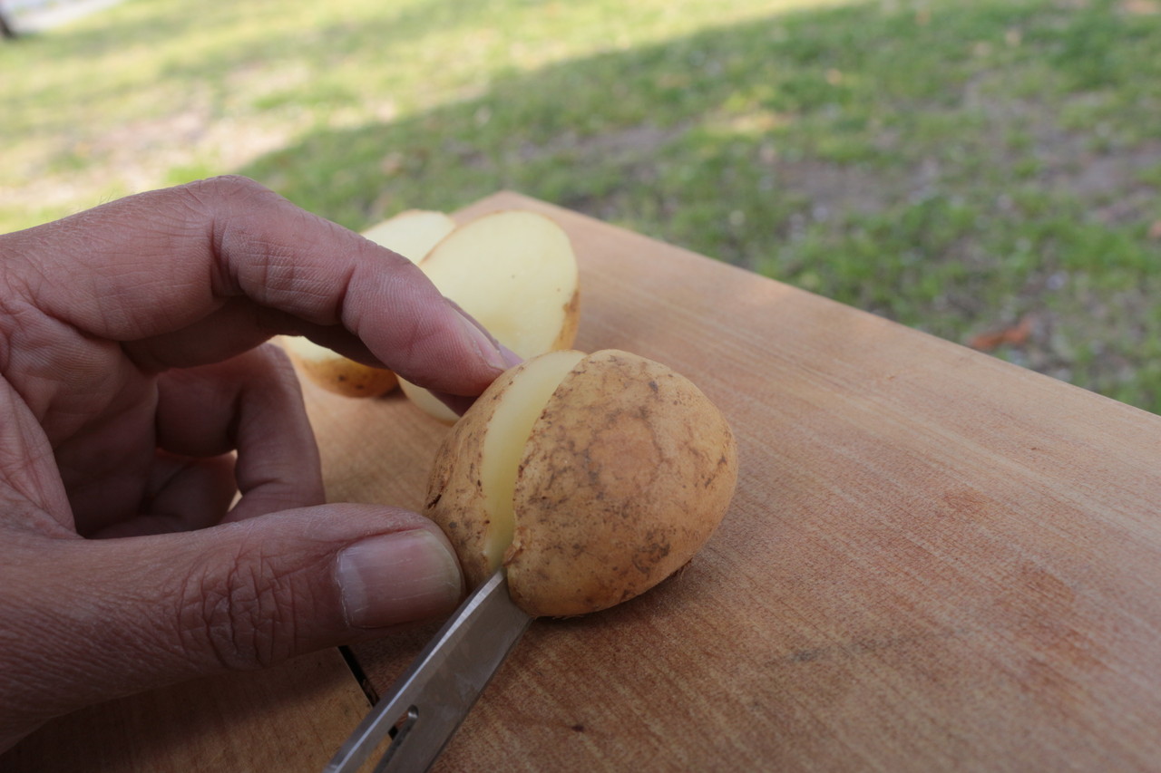 新ジャガをひと口大にカット。新ジャガは皮がやわらかいので、皮をむかずにそのままでOK。