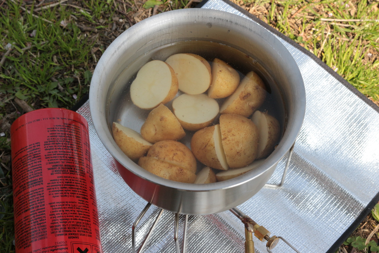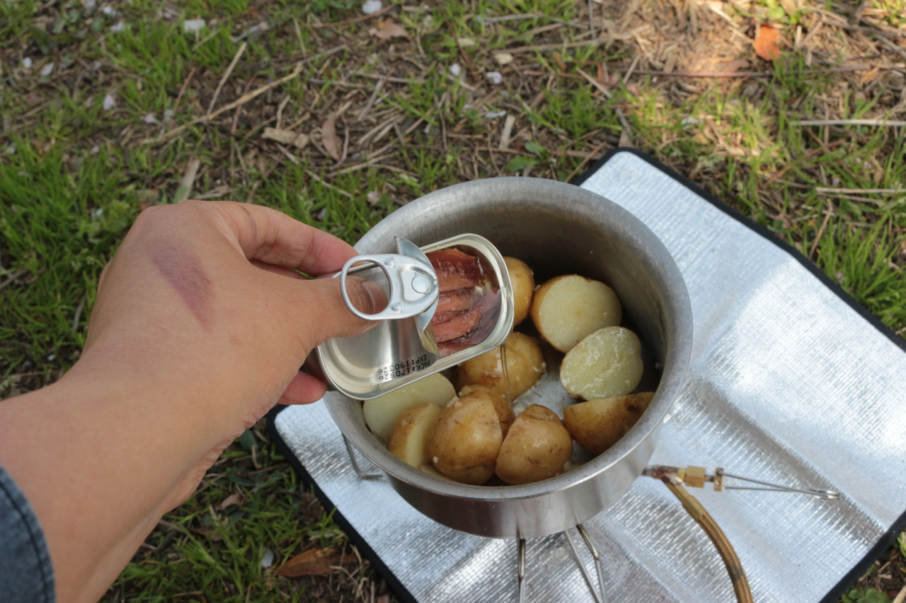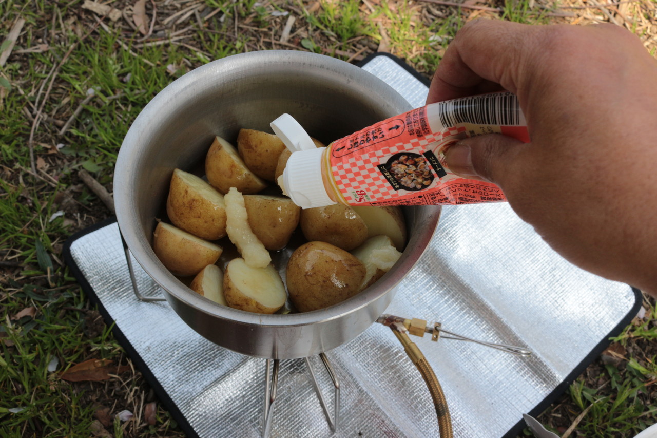 たっぷりの水で新ジャガをゆでます。水からゆでて、竹串や爪楊枝がスッと入るくらい軟らかくなったら、湯を捨てます。