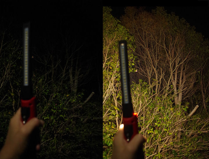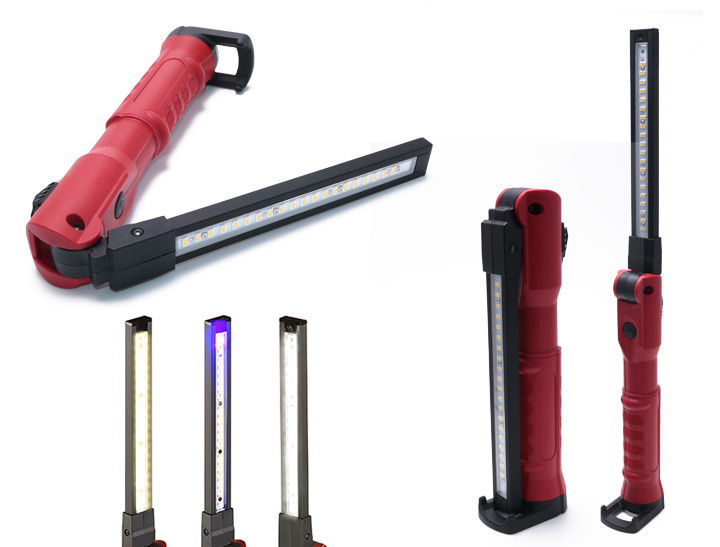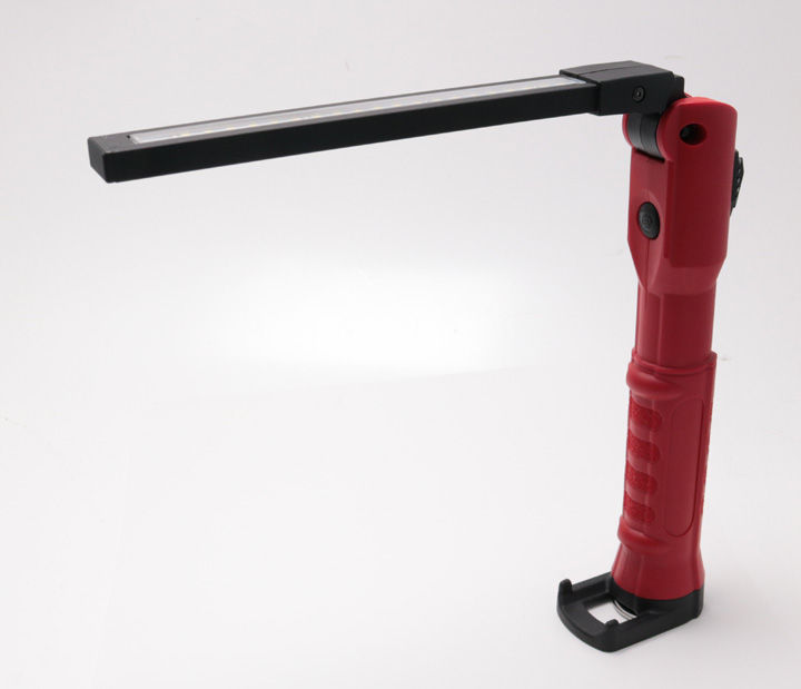 内蔵リチウムイオン充電池を装備し、重量は約485g。重量感はそれなりにあります。しかし、それも計算内と思われます。この手の「ワークライト」や「バーライト」と呼ばれる灯具は、自立して使えるモデルが少なかったりします。基本的には、車のエンジンルームや足回りなど、狭くて細い空間で使われることを想定しているので、平べったいものが多いのです。しかし、スイッチブレードは自立が可能です。光源が搭載されたブレード部分は180度展開でき、両面にそれぞれ異なるLEDが装備されています。