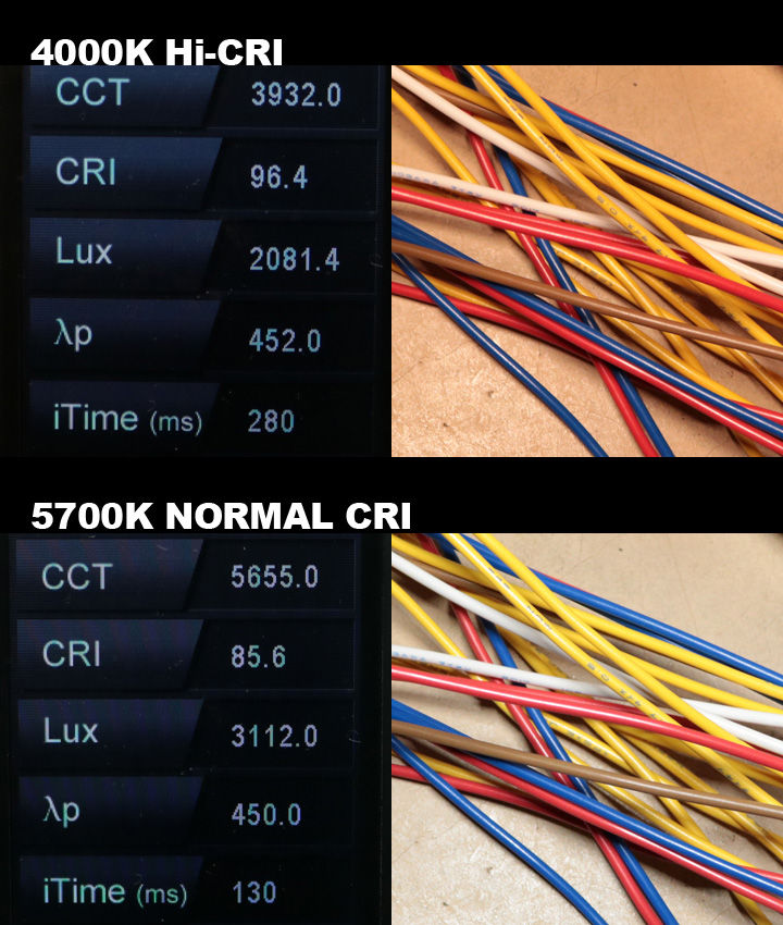 各LEDは、計測器で測っても概ねスペック通りの色温度と演色性でした。CRI(演色性)が高いほうが、色の認識がハッキリしているのが分かるかと思います。ハーネスなど似た色の配線が密集した部分に手を入れる場合、“ただ明るいだけ”では眩しい上に、色が分かり難いなどの弊害がありました。