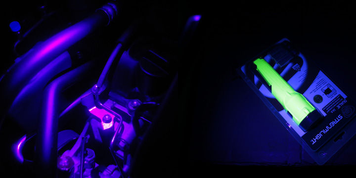 UV(紫外線)光は、蛍光体に激しく反応します。ストリームライト社の防爆ライトなど、特に良く反応します。車の整備では、UVに反応する蛍光体をエアコンの冷媒漏れ確認の際に使用するそうです。どの部分からガスが漏れているかを可視化することが目的です。UV光は、他に傷や汚れ、付着物などの確認など、さまざまな用途に使用されます。他社のバーライトでもUV光が先端に付いたモデルなど多く、需要の高さが伺えます。