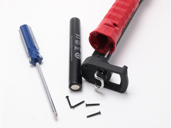 他社のバーライトと異なるのは、充電池が脱着可能な点。まだ、製品が発売されたばかりなので、予備の充電池は販売されていませんが、いずれ販売される予定です。完全に密閉されたバーライトは、充電池の寿命と共にライト本体が使えなくなりますが、スイッチブレードであれば、充電池を交換することで延命が可能です。決して安くはないプロ用ツールになるので、この点は重要かと思います。