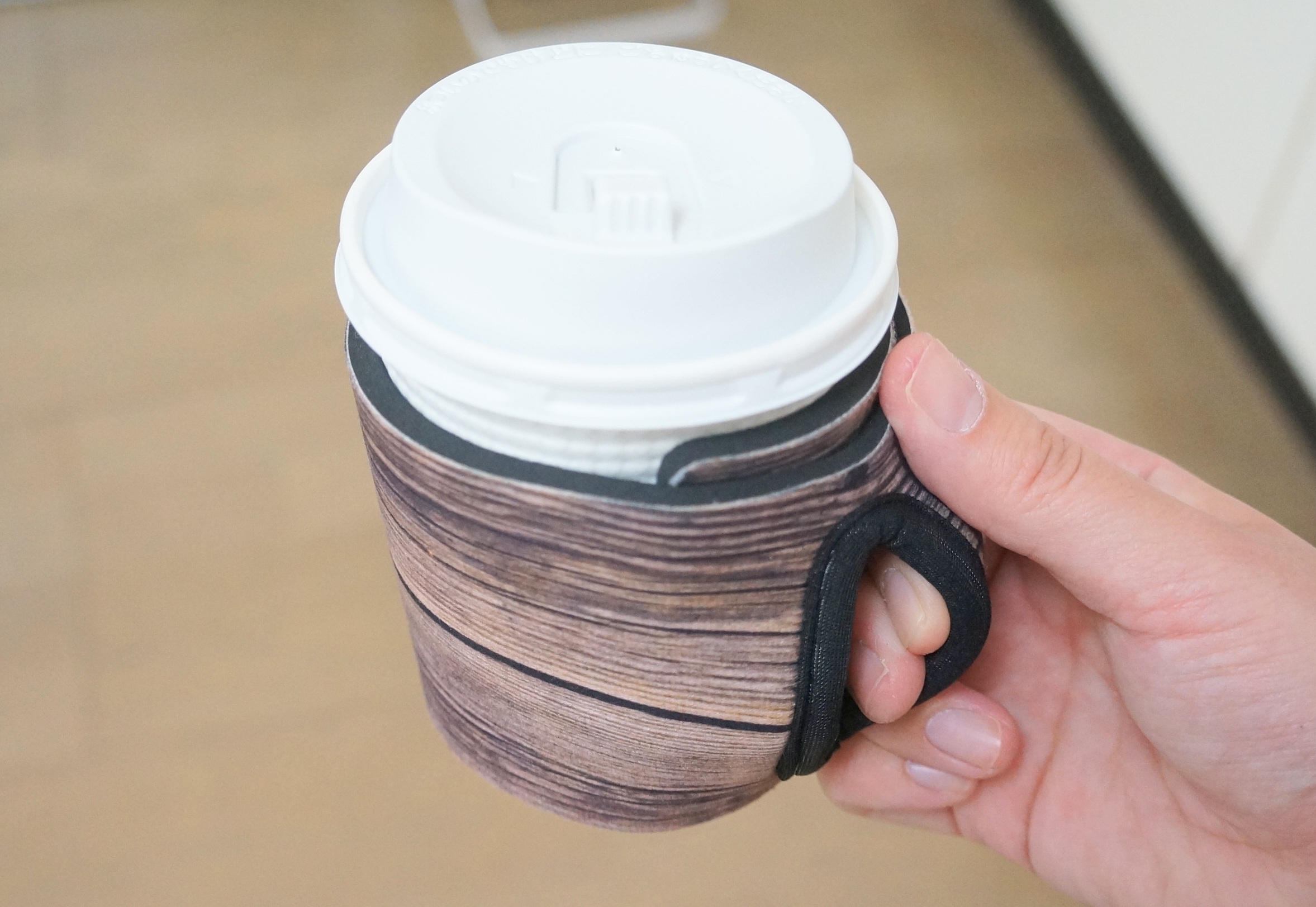 カップスリーブで覆ってしまえば、買ったばかりのコーヒーを持って「アチチ!」とならずに済みます。また、このようにカップに“取手”を取り付けられると、片手でカップを支えたまま、同じ手でほかの荷物を持つことも可能です。