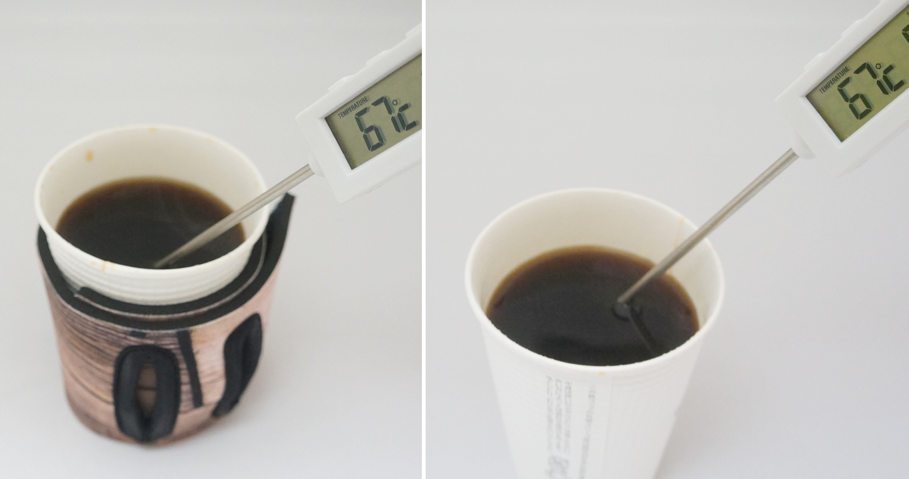 カップスリーブ付きは67℃→52℃、カップスリーブなしは67℃→46℃でした。もっと差が出るかと期待したのですが…、カップスリーブ付きの方がある程度は保温効果がある、という結果にはなりました。ちなみに、もう30分経ったあとの経過を見ると、カップスリーブ付きが52℃→42℃、なしが46℃→36℃という結果になりました。