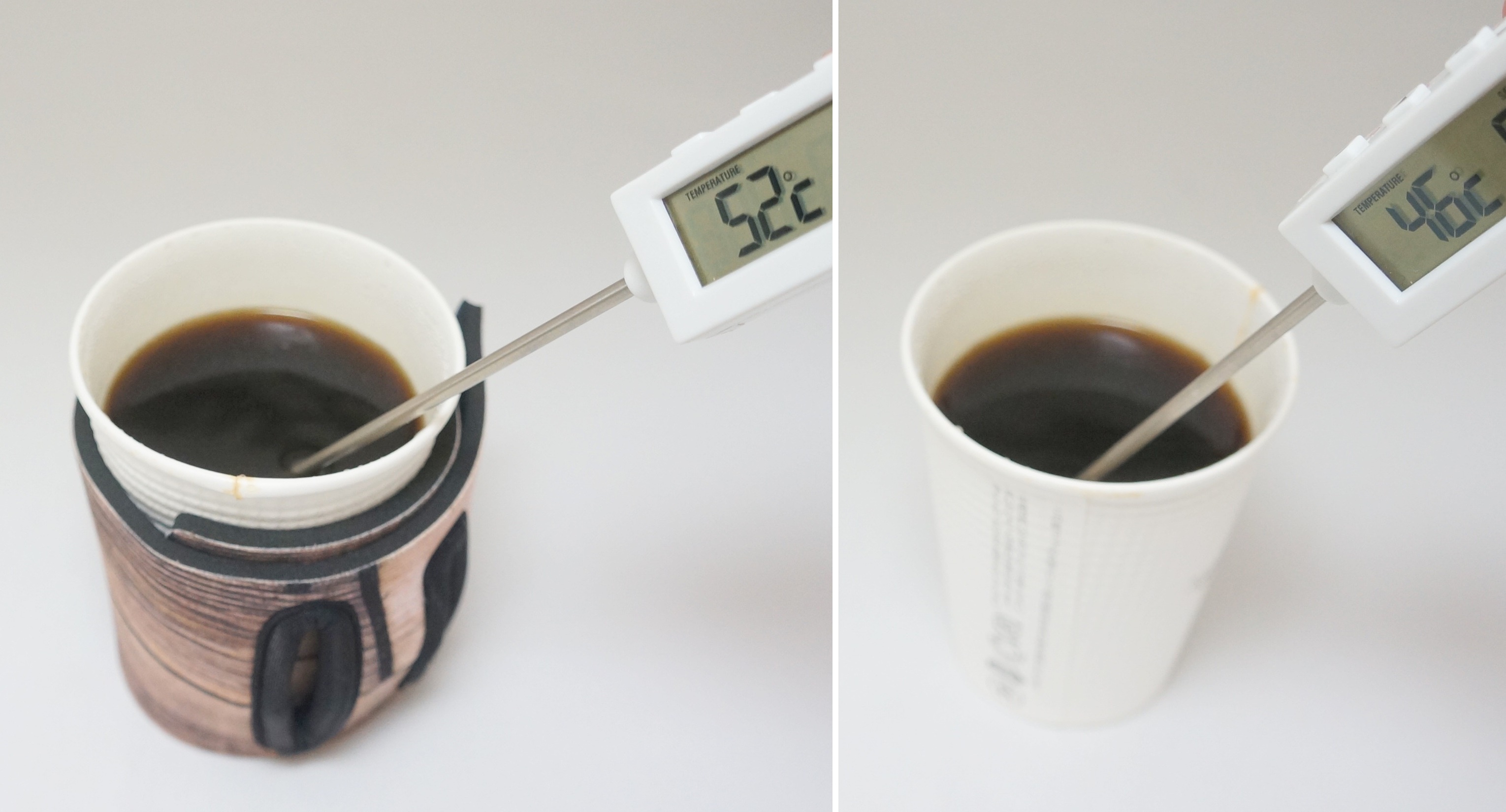 ▲カップスリーブを付けたコーヒー(左)。カップスリーブなしのコーヒー(右)