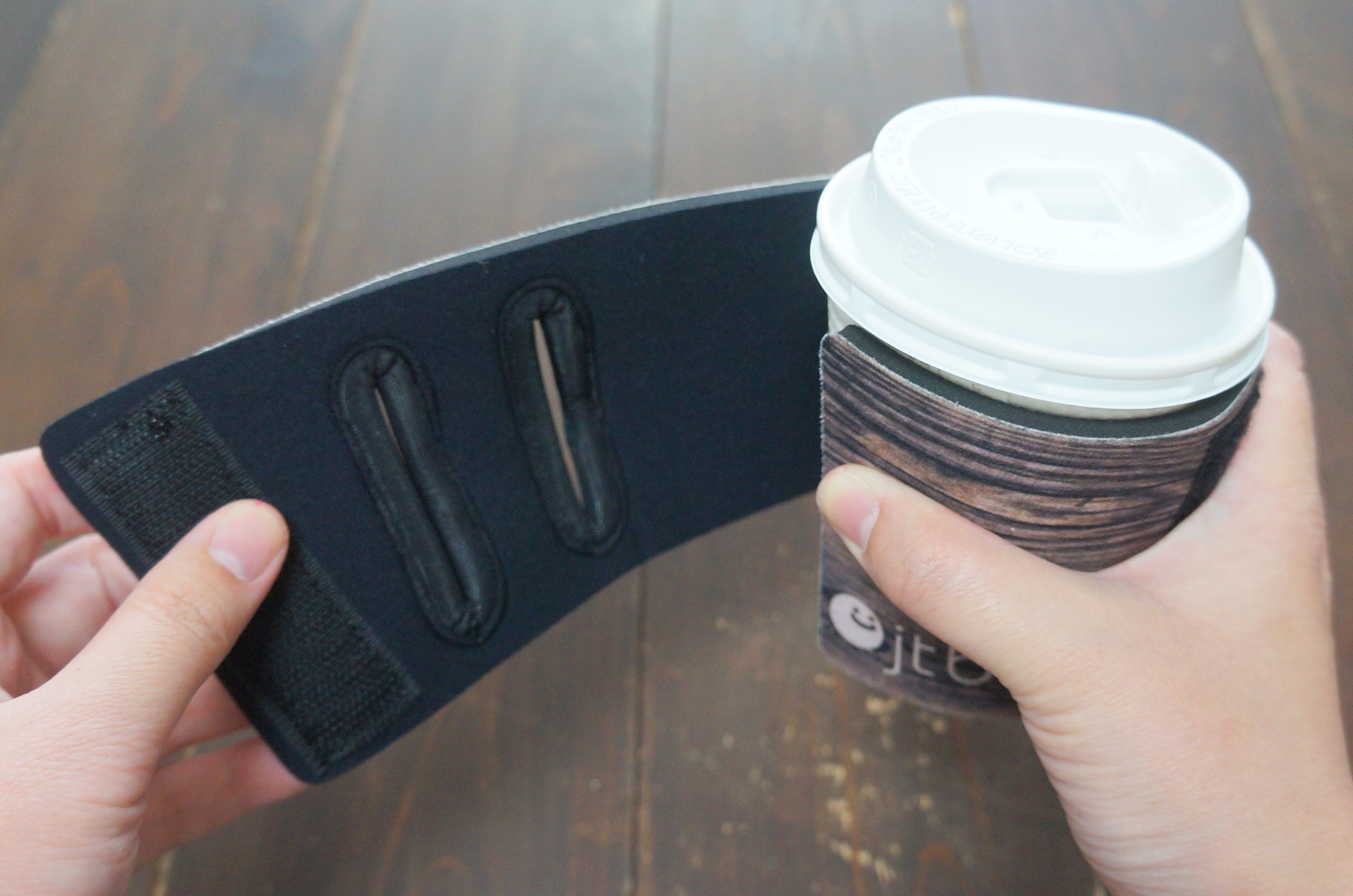 しかし、このカップスリーブには他にはないワザが。スリーブにスリット(切れ込み)が入っていて、そこに指を通すことでスリーブ自体を“取手”として利用できるのです。