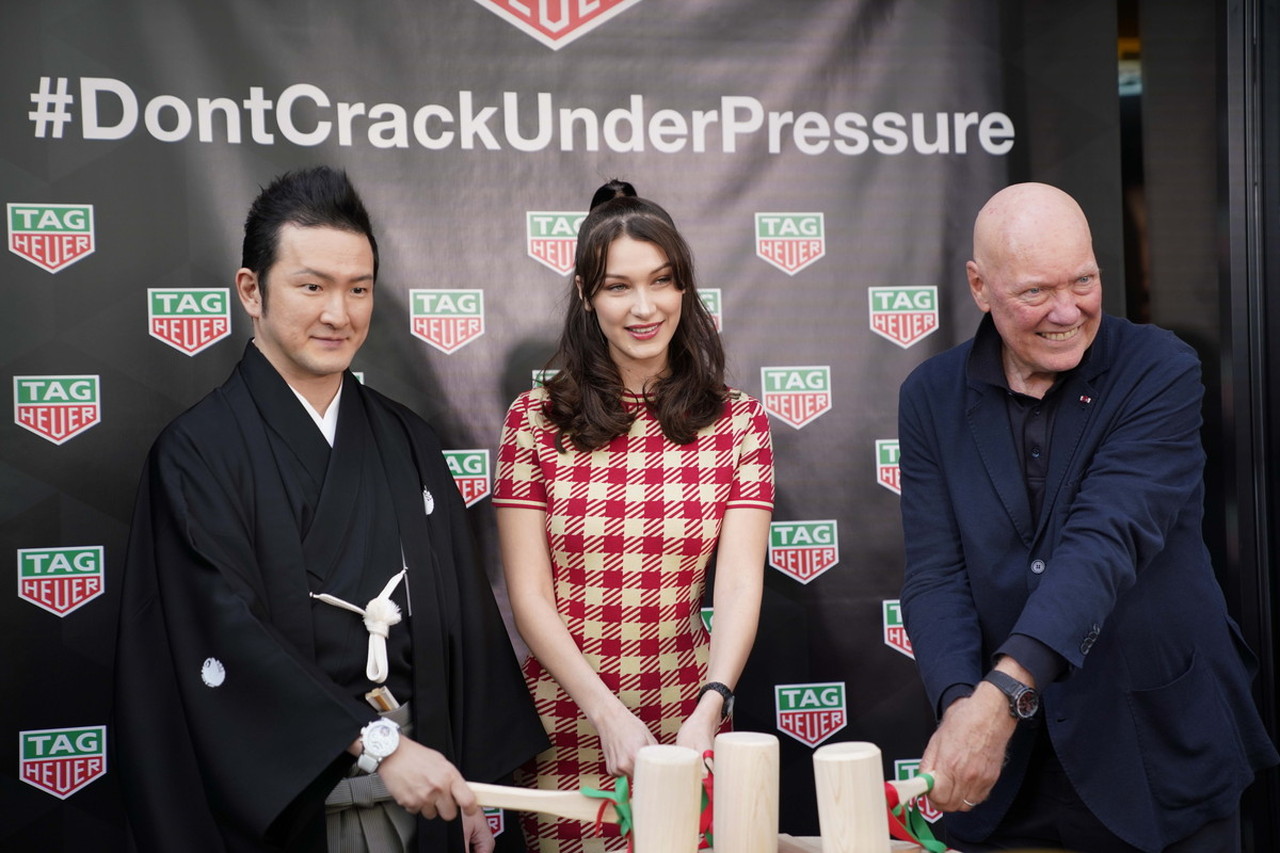 「タグ・ホイヤー 銀座 ブティック」のオープニングには、歌舞伎俳優の中村獅童さんと、タグ・ホイヤーのアンバサダーを務めるトップモデル ベラ・ハディッドさんも登場。