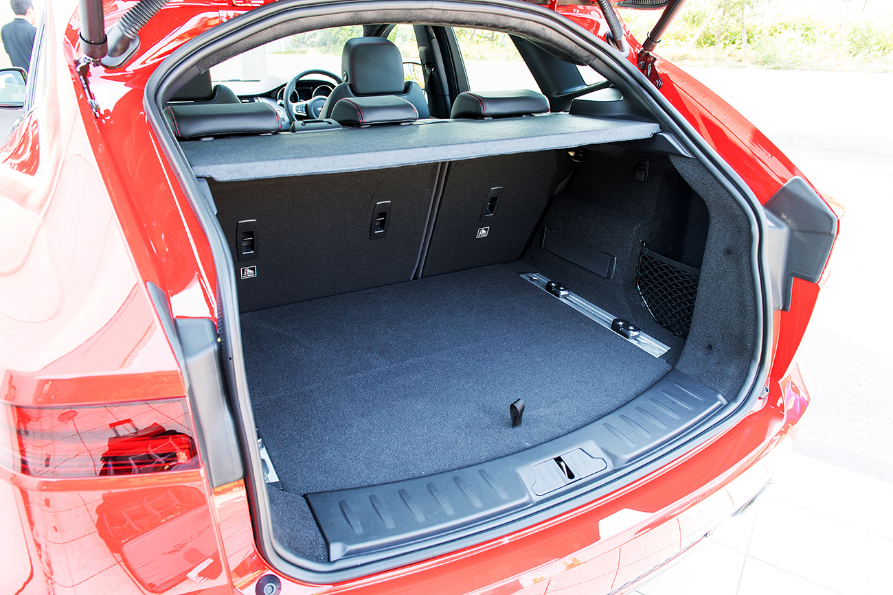 だからといって、E-PACEはデザインのために実用性を犠牲にしたクルマではない。4410mmという全長ながら、リアシートはヒザまわりもヘッドスペースも十分なスペースがあるし、ラゲッジスペースも577Lという十分な容量を確保している。確かに、全幅は1900mmと広いが、短い前後オーバーハングやグッと寝かされたリアピラー、視覚的にはコンパクトに見えるキャビンなど、スポーツカーの要素を盛り込みながら、実用性においてもネガティブに感じる部分はない。