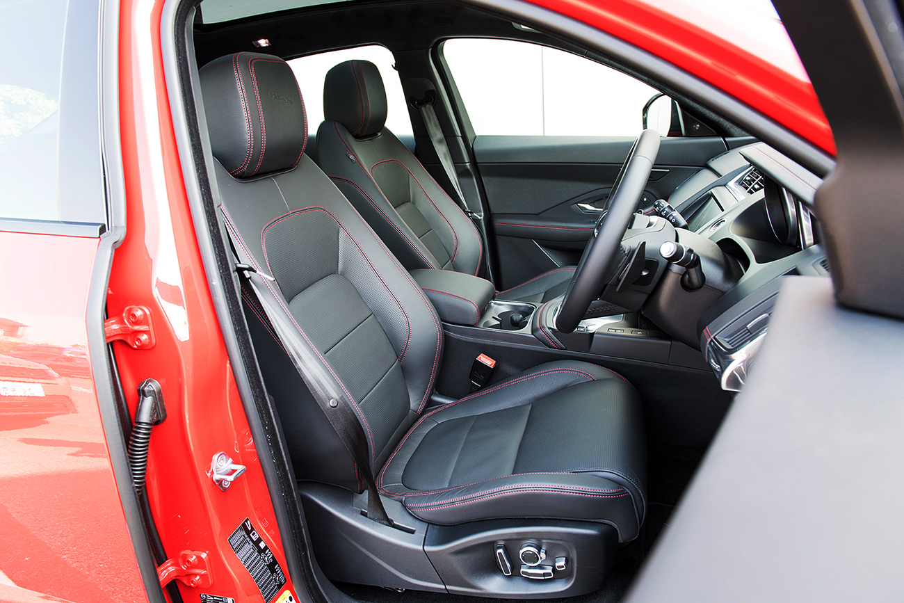さらにドライバーズシートに収まると、そうしたコンセプトをより明確に感じられる。E-PACEは、ランドローバー「レンジローバー イヴォーク」とプラットフォームを共有したクルマで、フロアは相応に高い。そこに低めのシートを配置した結果、ドライビングポジションはまるでスポーツカーのように、足を前方へ投げ出すスタイルになる。また、ステアリングやシート、ダッシュボード回りの位置関係も、とてもスポーツカー的だ。確かに、ミニバンのようにアップライトなシートポジションに設定すればスペース効率は高まるが、そうすると、必然的にステアリングの角度は起きてくるし、その分、スポーツモデルらしさは損なわれてしまう。