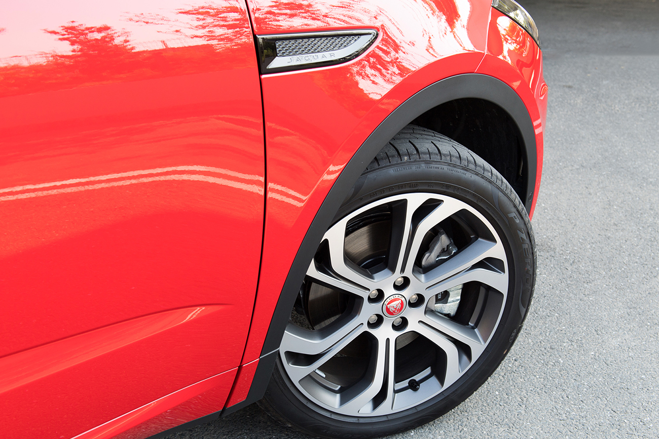実際、E-PACEのルックスをつぶさに見ていくと、ジャガーのピュアスポーツモデル「F-TYPE(エフ・タイプ)」のエッセンスが、随所に取り込まれていることがよく分かる。ヘッドライトやテールランプのデザインはいうに及ばず、サイドウインドウのグラフィックやリアフェンダーの膨らみ具合、フロントフェンダーの後端に付いたエアアウトレット風の加飾まで、まさにそっくりだ。